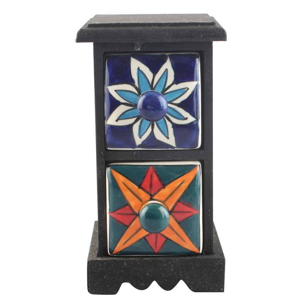 Spice Box-1065 Masala Rack Container Gift Item. Ceramic Drawers in Wooden Frame. The Spice Boxes are designed with different patterns. These boxes are made using natural wood which does not harm the purity of spices.