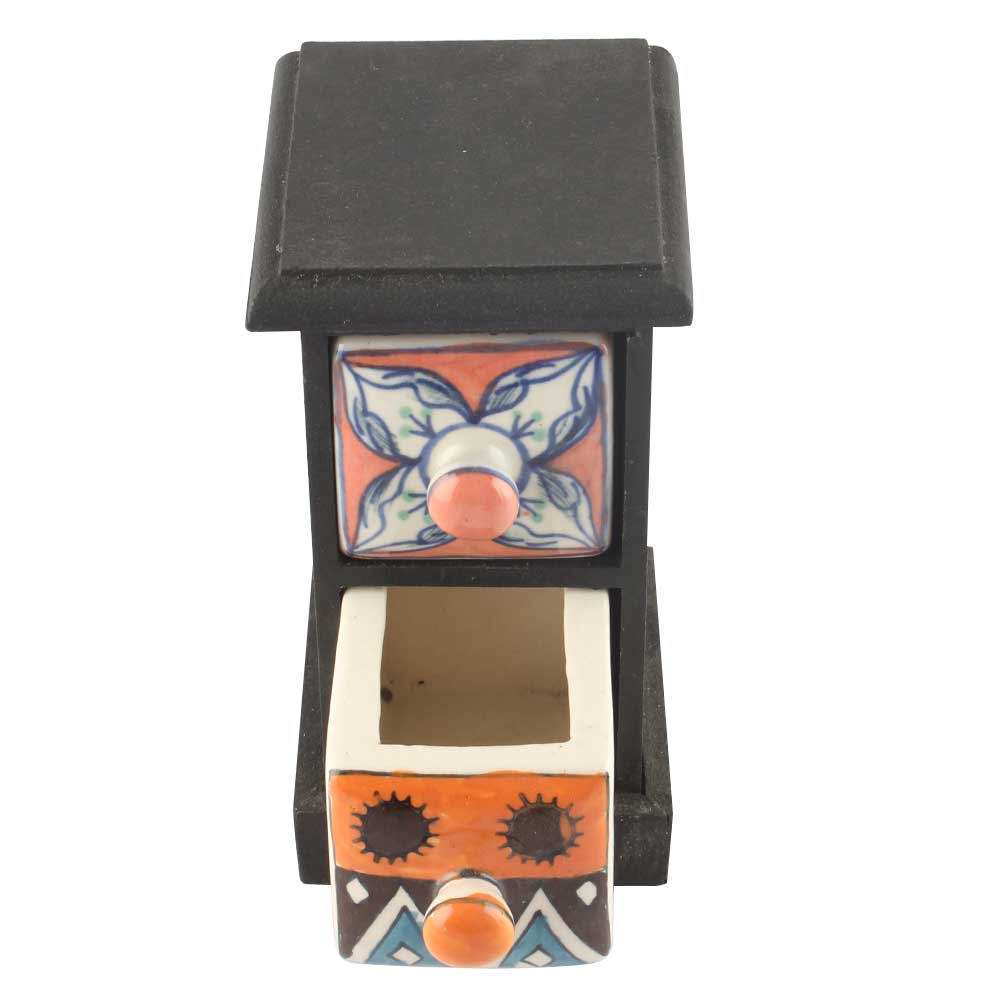 Spice Box-1090 Masala Rack Container Gift Item. Ceramic Drawers in Wooden Frame. The Spice Boxes are designed with different patterns. These boxes are made using natural wood which does not harm the purity of spices.
