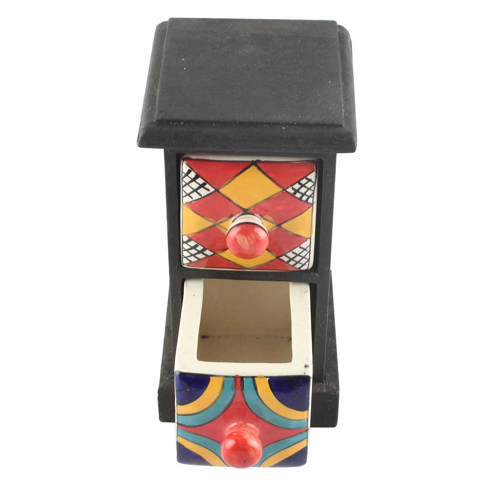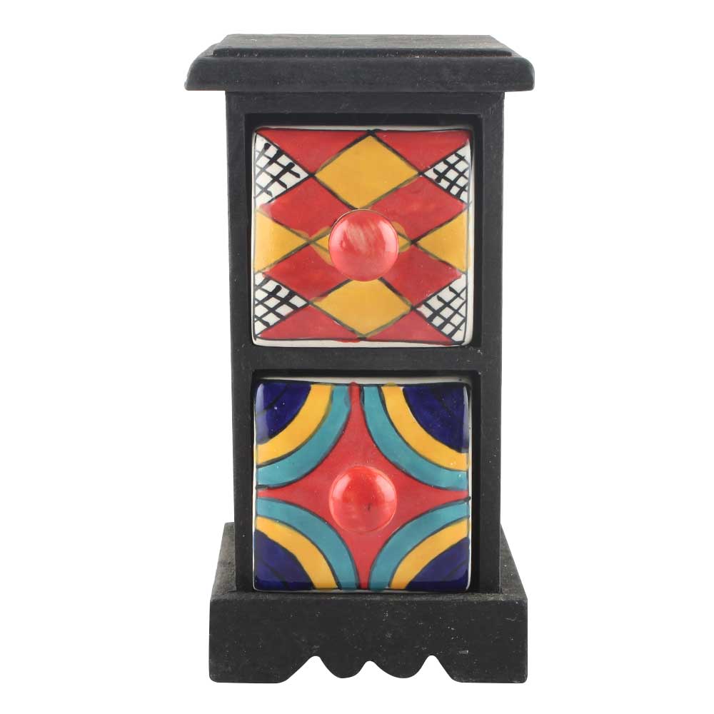 Spice Box-1095 Masala Rack Container Gift Item. Ceramic Drawers in Wooden Frame. The Spice Boxes are designed with different patterns. These boxes are made using natural wood which does not harm the purity of spices.