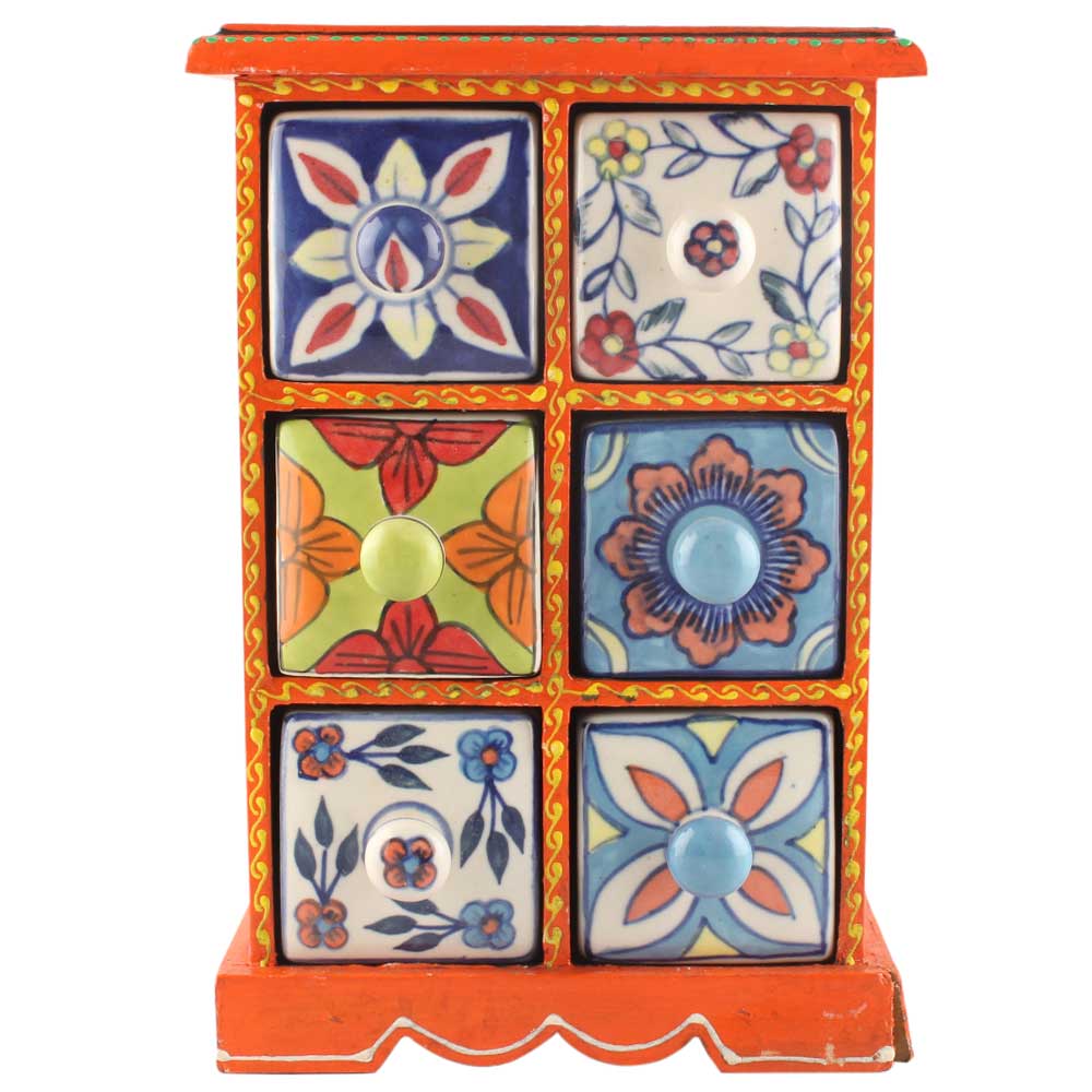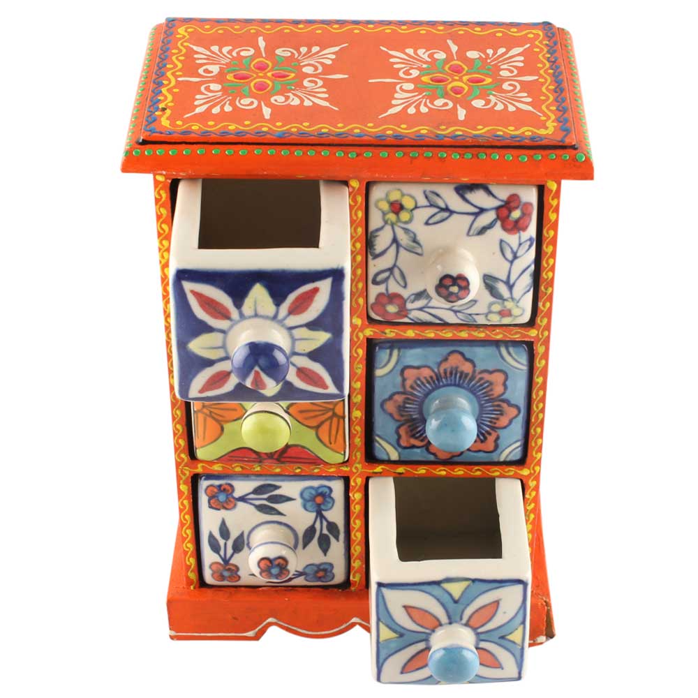 Spice Box-1112 Masala Rack Container Gift Item. Ceramic Drawers in Wooden Frame. The Spice Boxes are designed with different patterns. These boxes are made using natural wood which does not harm the purity of spices.