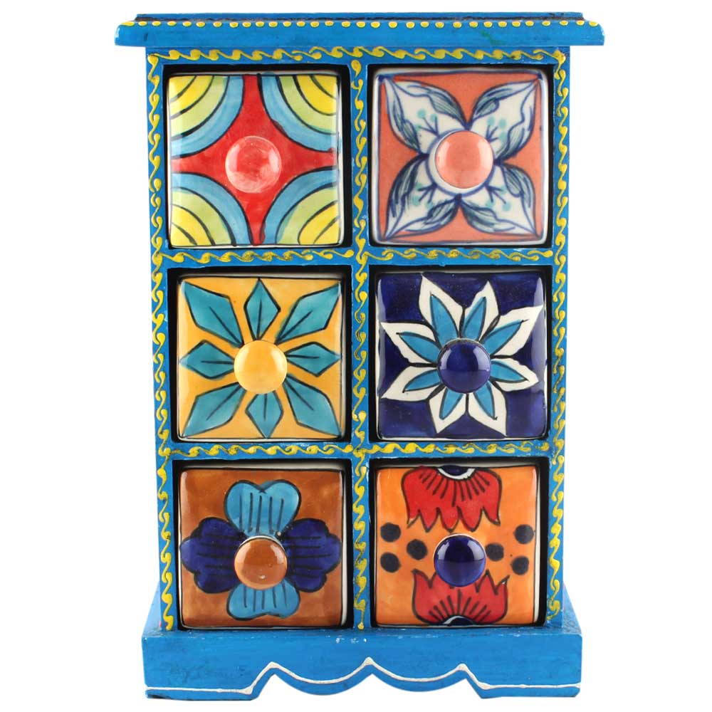 Spice Box-1130 Masala Rack Container Gift Item. Ceramic Drawers in Wooden Frame. The Spice Boxes are designed with different patterns. These boxes are made using natural wood which does not harm the purity of spices.