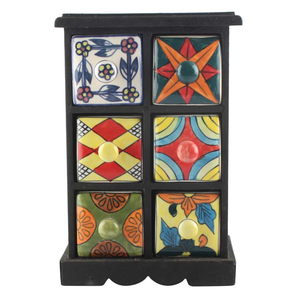 Spice Box-1185 Masala Rack Container Gift Item. Ceramic Drawers in Wooden Frame. The Spice Boxes are designed with different patterns. These boxes are made using natural wood which does not harm the purity of spices.