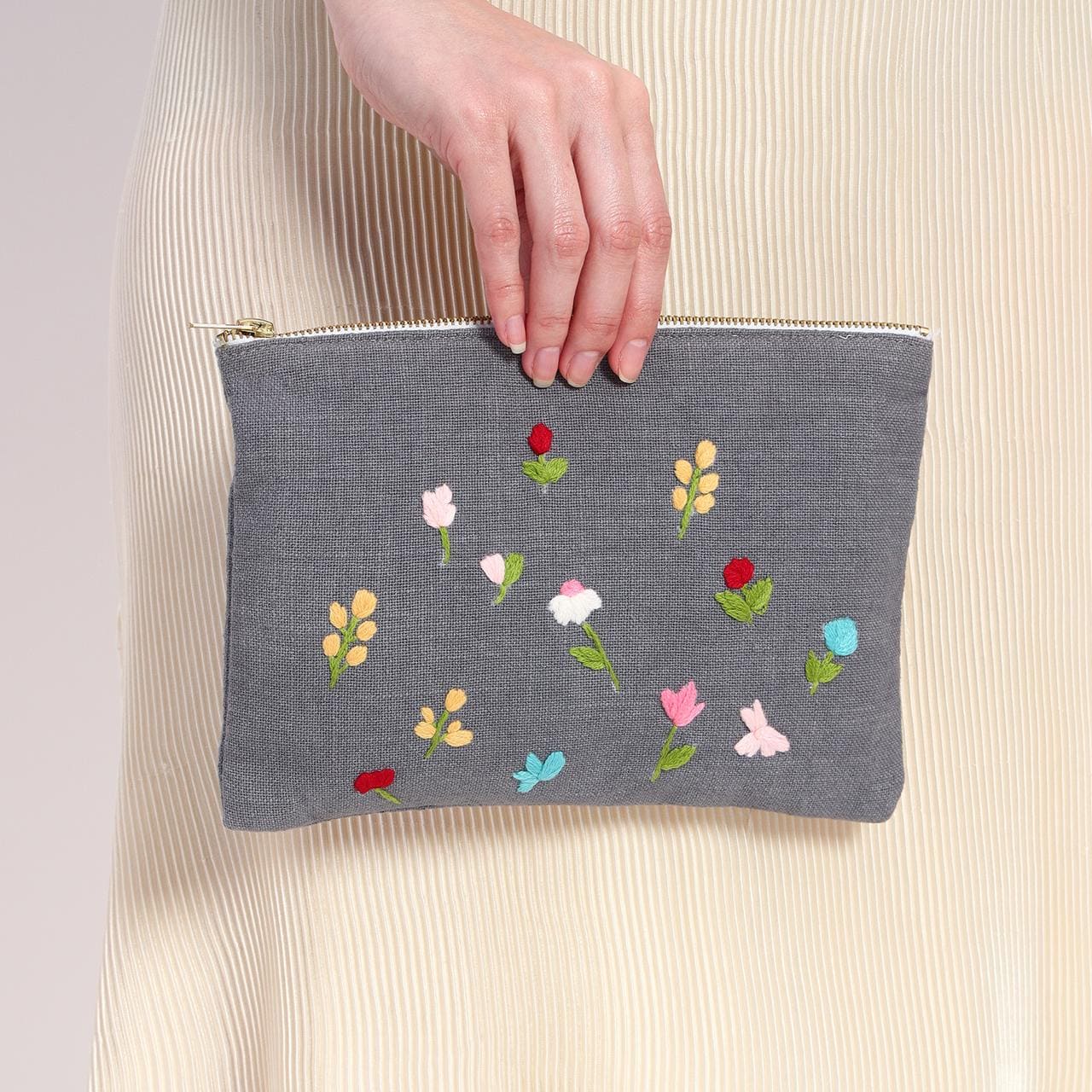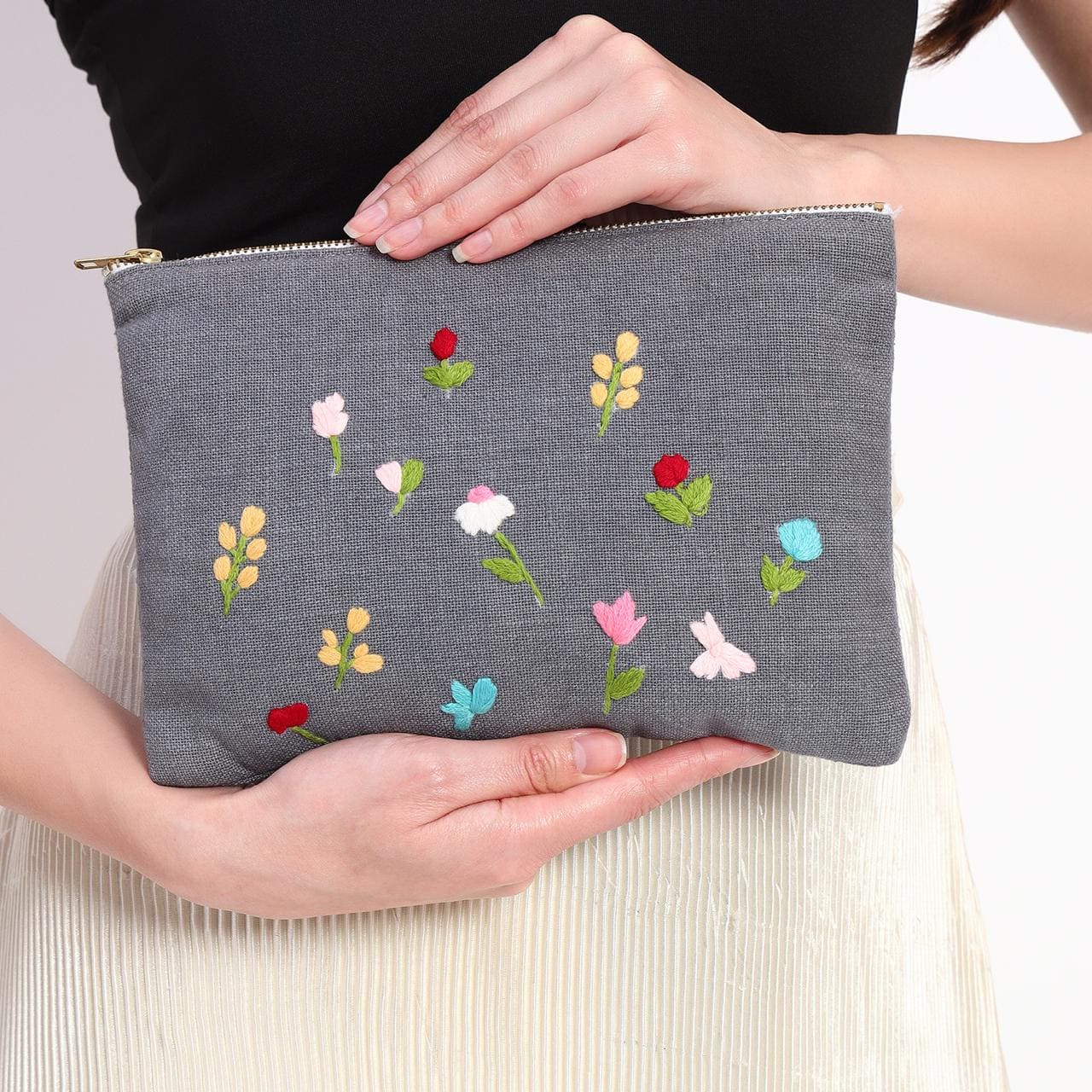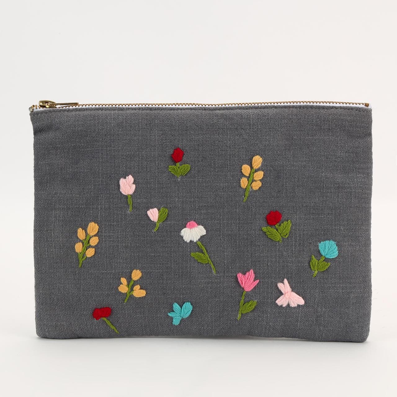 Add a touch of elegance to your accessories with this beautifully crafted floral embroidered fabric pouch. Made from high-quality, soft grey fabric, this pouch features delicate hand-stitched floral embroidery in vibrant colors , giving it a charming and artistic appeal. Whether you're looking for a stylish travel pouch, an elegant makeup bag, or a unique gift, this embroidered pouch is the perfect blend of fashion and functionality.
