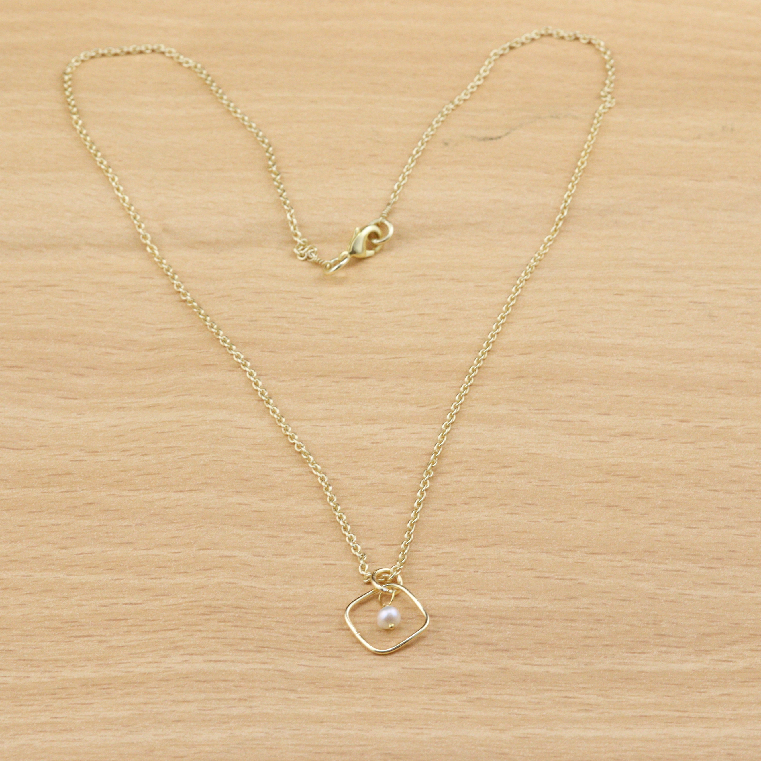 This Square Charm with Pearl Necklace beautifully blends modern minimalism with timeless sophistication. Crafted from solid brass and plated in luxurious 22K gold, it features a sleek geometric square charm paired with a luminous pearl accent that adds soft, refined elegance. At 18 inches, the necklace rests gracefully along the collarbone, offering a contemporary yet classic accessory suitable for both daily wear and special occasions. Handmade by skilled artisans, it carries a unique charm and polished finish.