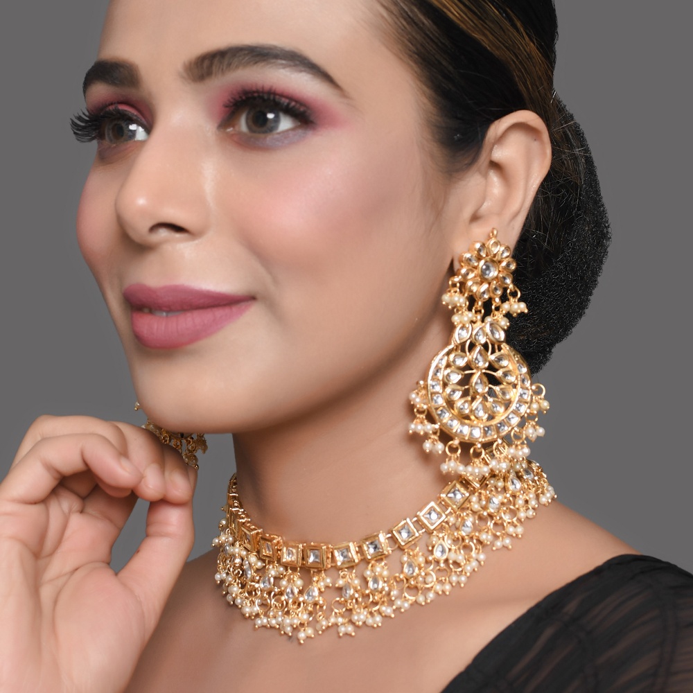 The Square Mirror Pearl Fringe Choker Necklace Set for Wedding Wear is designed to create a striking bridal statement with timeless craftsmanship. Crafted in polished golden brass, the choker features square mirror stones arranged in a structured pattern that reflects light beautifully. Delicate pearl fringe accents cascade along the neckline, adding graceful movement and luxurious texture. With its extended 30 inch length, this handcrafted set brings royal elegance to wedding and ceremonial attire.