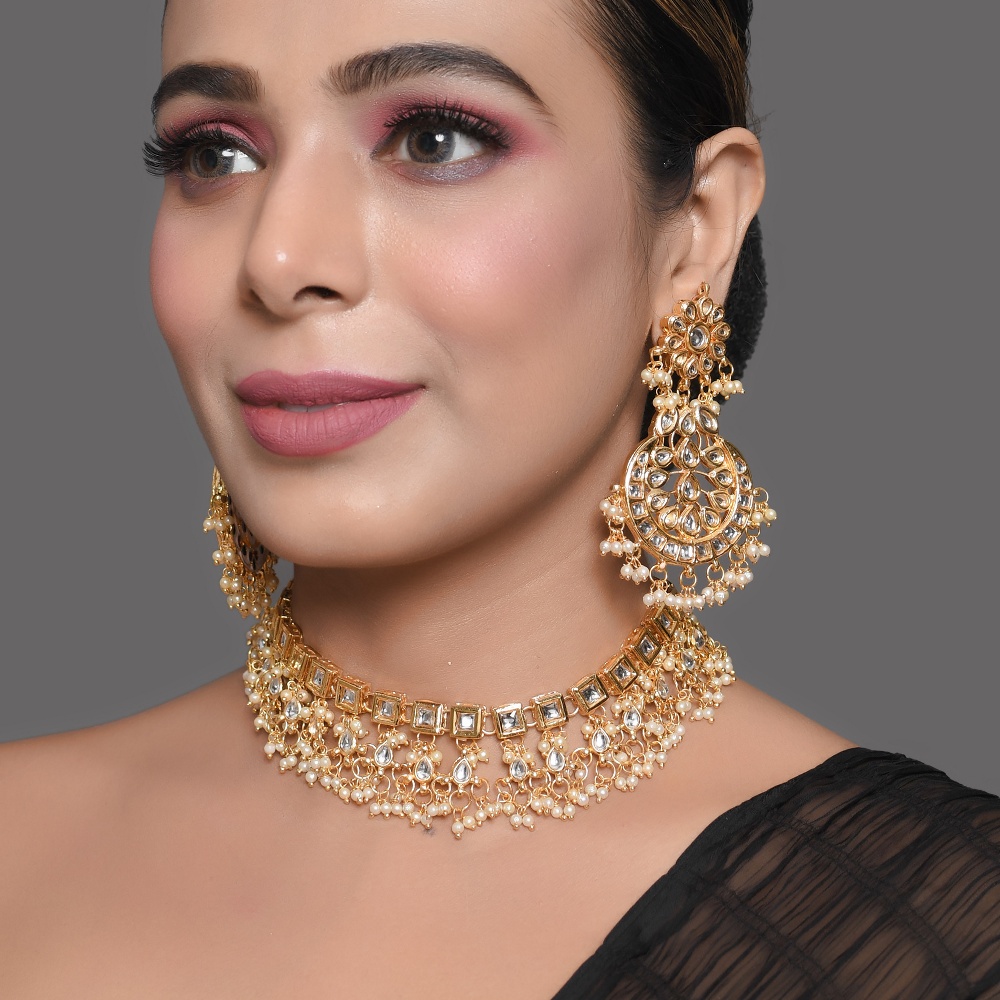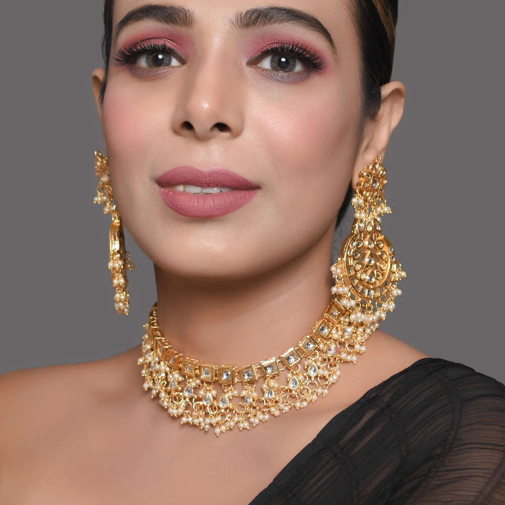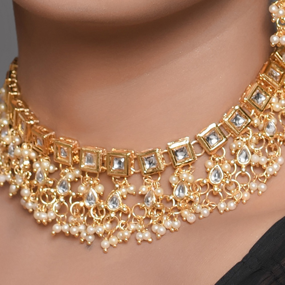 This elegant mirror stone choker necklace set showcases a structured row of square-cut reflective stones finished with a soft cascade of pearl fringes. Designed to sit gracefully along the neckline, the choker creates a rich bridal look with balanced sparkle and movement. Matching earrings complete the ensemble for a refined statement. Choker Necklace Highlights Handcrafted using traditional jewellery techniques, this set blends classic structure with delicate pearl detailing. Square mirror stone choker with uniform geometric alignment Pearl fringe detailing for soft movement and texture Includes matching handcrafted statement earrings Comfortable fit designed for extended wear Traditional hand-assembly ensures artisanal uniqueness Specs & Materials Material: Metal alloy with mirror stones and pearl accents Colour: Gold tone with reflective stones and ivory pearls Design: Structured choker with coordinated earrings Origin: Handmade in India and individually quality-checked Natural variations highlight handcrafted workmanship Adjustable tie-back for secure and flexible fitting Styling & Gift Inspiration Perfect for weddings, receptions, and festive occasions Pairs beautifully with sarees, lehengas, and velvet ensembles An elegant gift choice for brides and special celebrations Adds richness without overpowering the outfit Care Guide Store in a dry pouch and avoid contact with water, perfume, or chemicals. Gently wipe after use to preserve shine and pearl finish. Artisan Craftsmanship This jewellery set is entirely handcrafted using traditional methods. No machines are used, ensuring each piece carries authentic artisanal character.