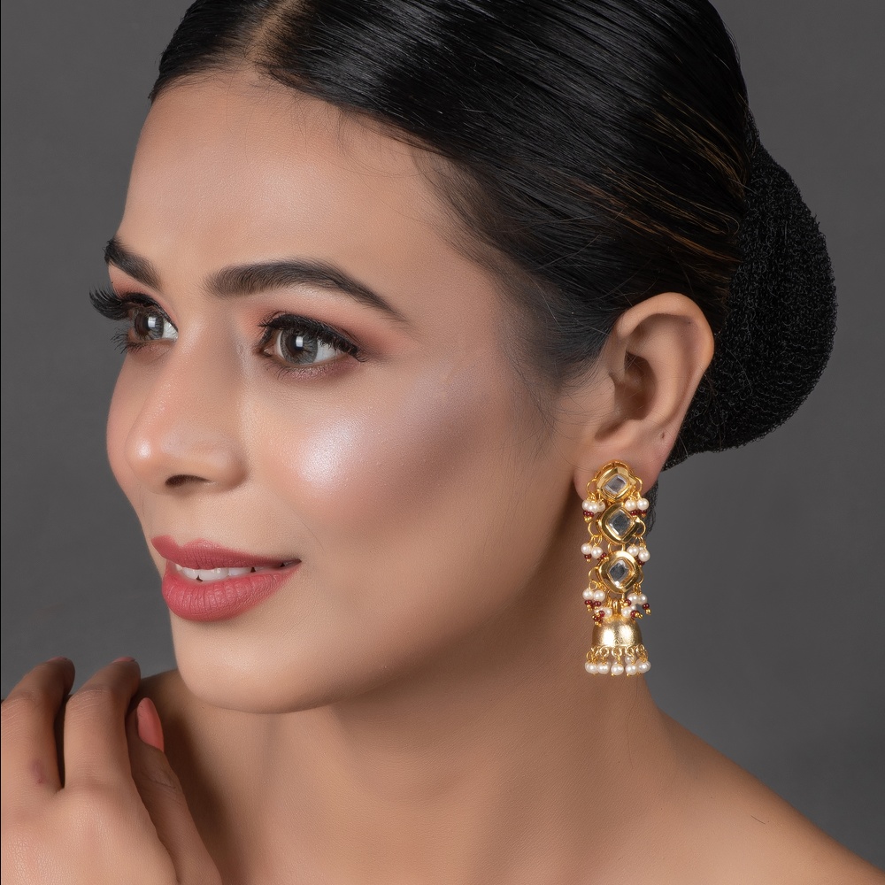 These earrings are handcrafted using traditional techniques and feature a unique combination of square mirror stones, pearl and red bead clusters, and a jhumka drop, ensuring each pair is one-of-a-kind and durable.