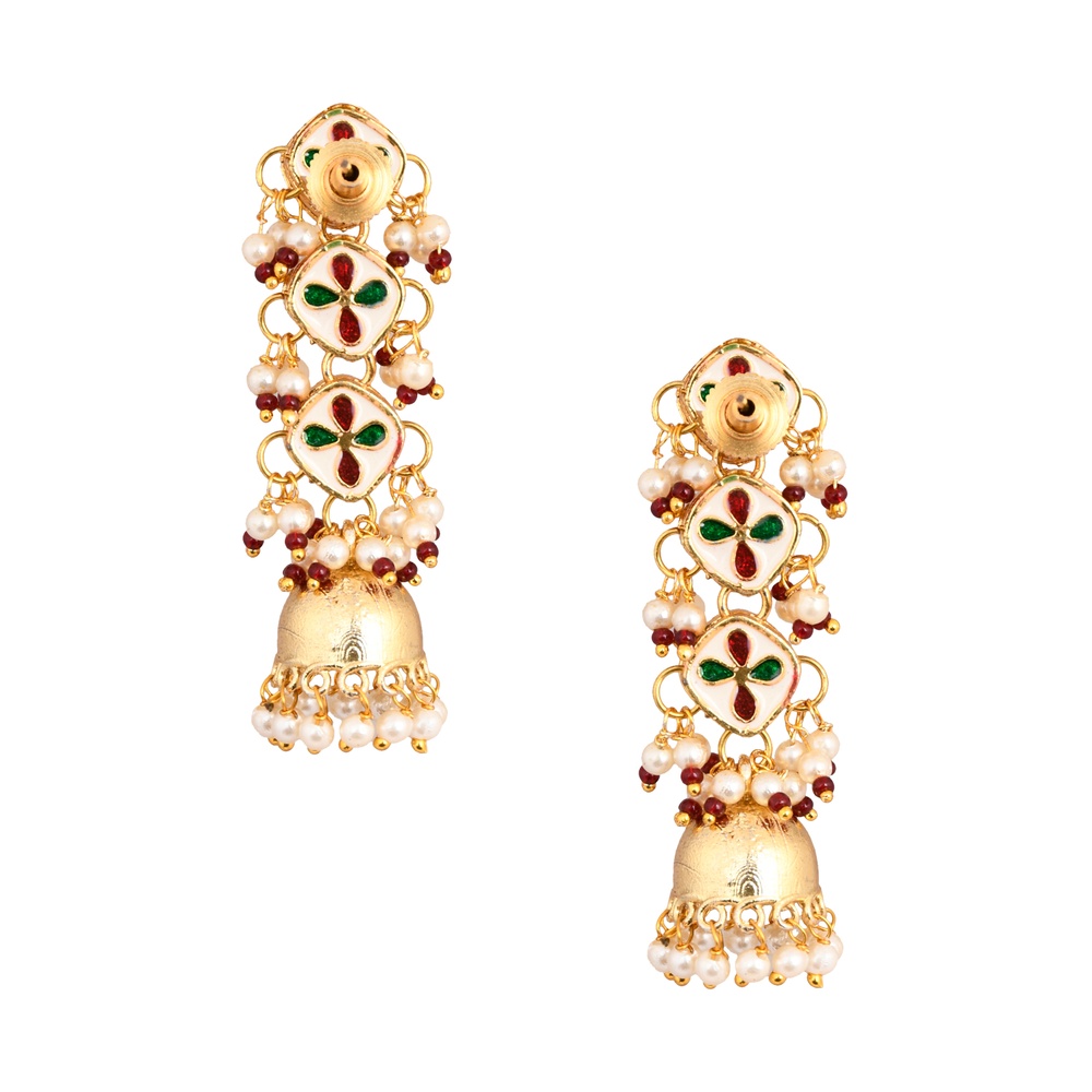 Celebrate classic elegance with our handcrafted Square Mirror & Pearl Jhumka Earrings with Red Bead Accents. These striking earrings feature a vertical arrangement of square mirrored stones framed in gold-tone metal, interspersed with delicate clusters of tiny pearls and rich red beads. A traditional bell-shaped drop finished with a pearl fringe adds heritage charm and graceful movement. Ideal for weddings, festivals and thoughtful gifting, they blend heritage craftsmanship with a modern twist.