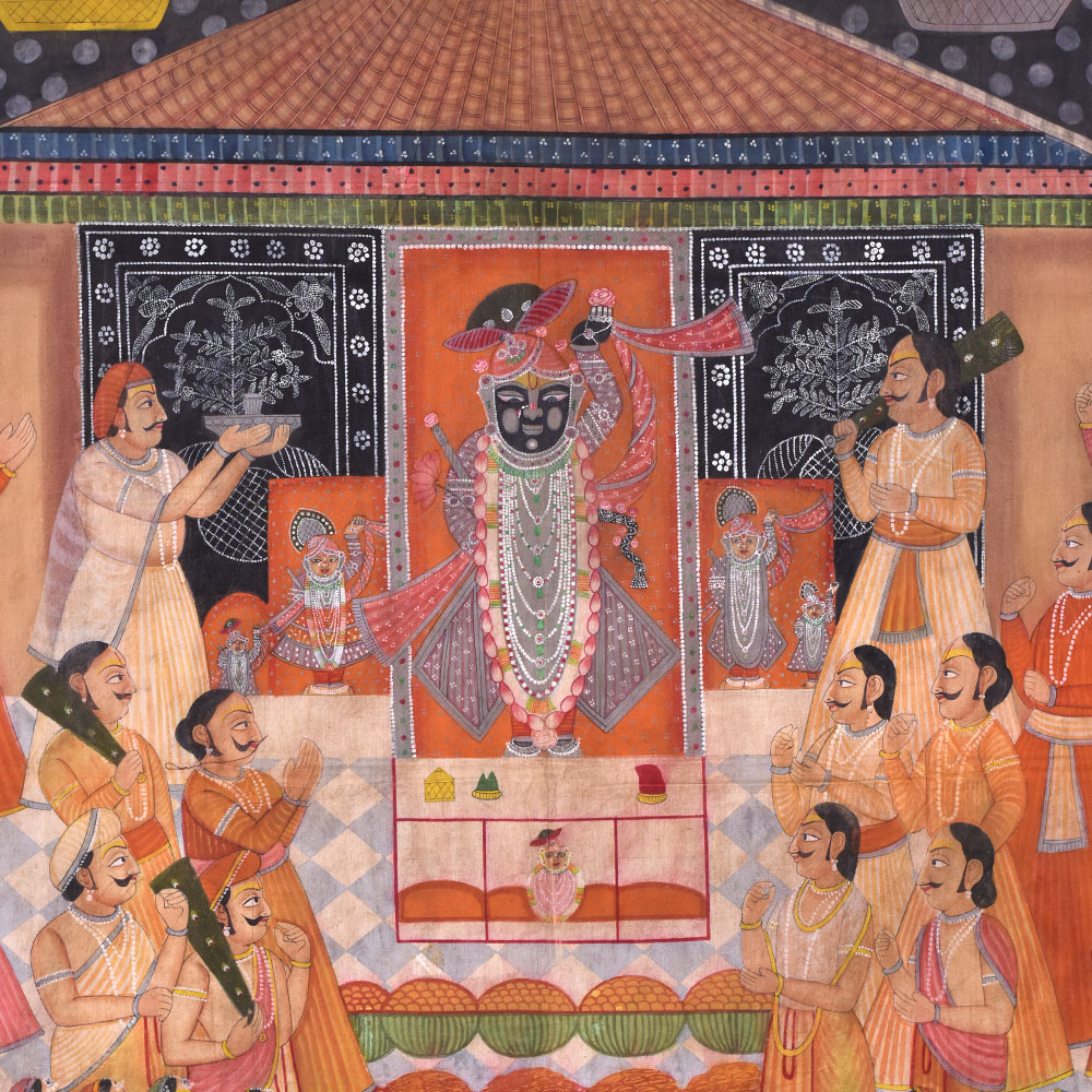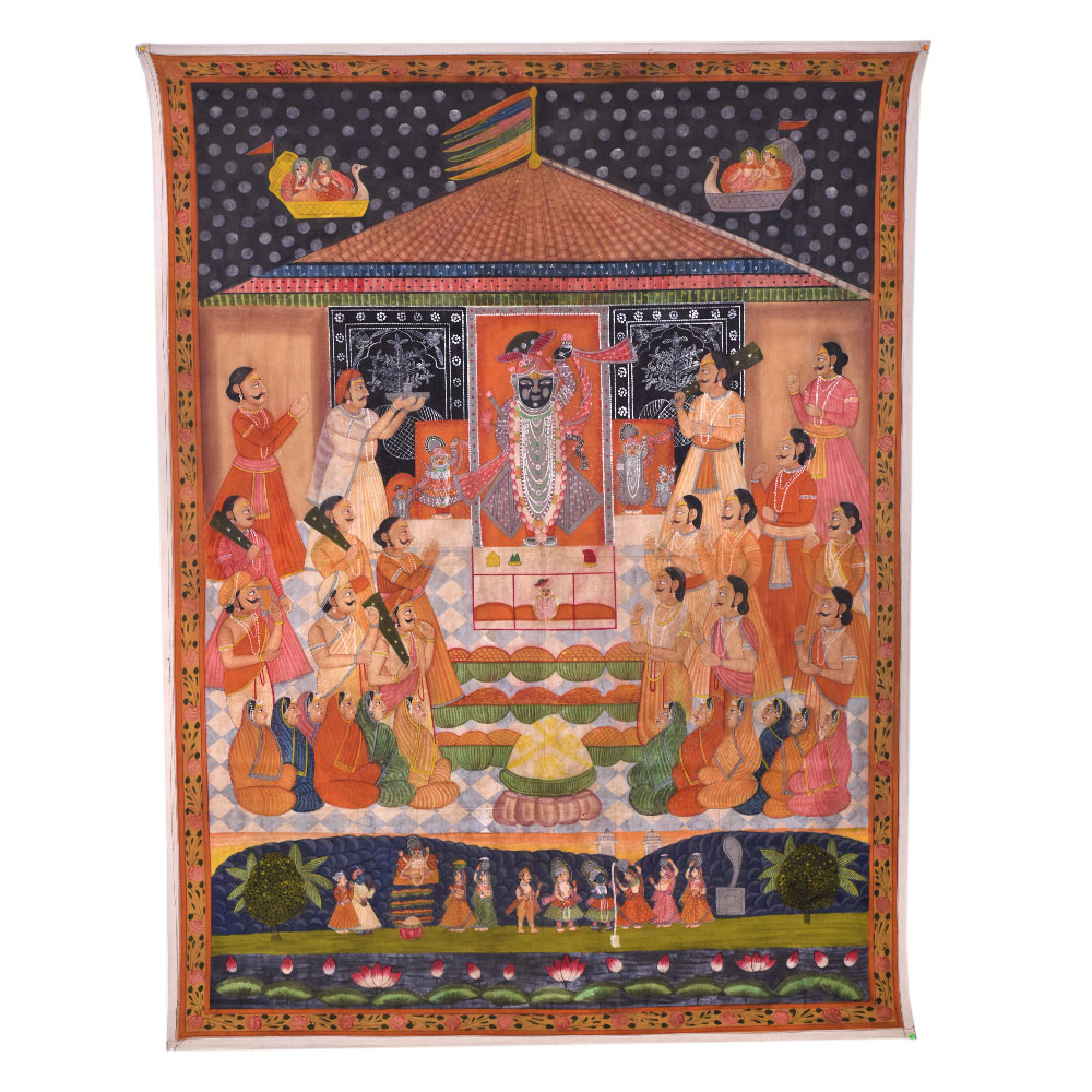 The Sreenathji Pichwai design painting of Aarti with followers and prasad portrays Lord Sreenathji surrounded by his devotees as they execute an aarti rite and present prasad (holy food) to the god. Painting is a traditional Indian art style that began in Rajasthan and is famous for its elaborate designs, vibrant colours, and religious importance. Lord Sreenathji, a manifestation of Lord Krishna, is usually represented in the centre, surrounded by his devotees, who are depicted in various stances of adoration, presenting flowers, candles, and prasad to the deity. The picture also includes ornamental themes such as lotus flowers, peacocks, and other birds, contributing to its visual appeal. The intricate workmanship and the use of natural dyes and colours are used in the creation of a Sreenathji Pichwai art painting. The painting's vivid and lively colours, including red, green, yellow, and gold, are derived from natural sources such as flowers, herbs, and minerals. The picture is not just a work of art but has significant religious importance for Hindus. It is said to bring wealth, happiness, and good fortune to the home or temple where it is displayed. The picture generates a spiritual atmosphere and aids in Lord Sreenathji's devotion. A great addition to any art collector's collection and a lovely way to decorate the walls of a temple or house.