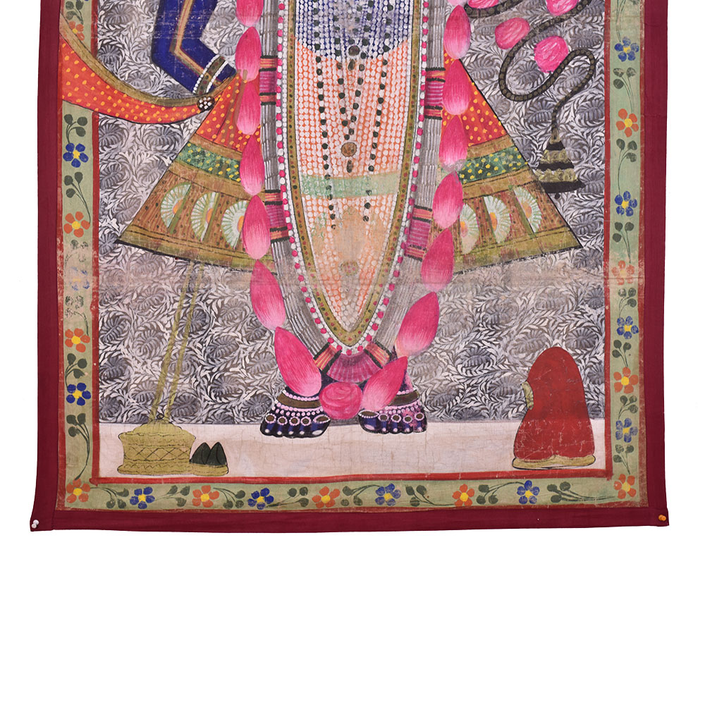 Sreenathji Pichwai Painting in a traditional attire along with a garland of flowers and holding lotus flower. This painting is created by devotee-artists of Nathwara. Lord SreenathJi Pichwwai Painting is a very popular wall decoration for home, hotel and lobby decoration, temple decoration, conference hall, resort , Diwali gift, house warming gift and stage decoration.