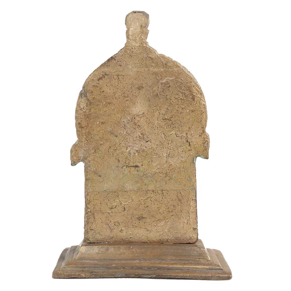 Hand made brass standing deity, depicted standing with four arms and cobra hood on top with arched panel behind arched plaque, raised on stepped base. used for worship, puja and temple decoration, souvenir, hotel, restaurant decoration, wedding gift, anniversary gift and special gift on Diwali for your near and dear ones.