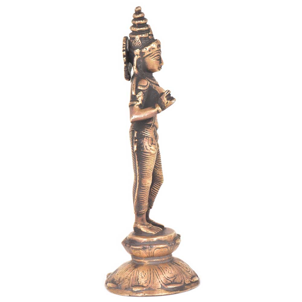 Parvati is long and lean with broad womanly hips and thin legs and arms. In homes and temples throughout south India Lord Shiva as Nataraja usually has Parvati as Shivakami in the standing posture beside him as he performs his dance of creation and destruction. Her conical shaped headdress is typical of South Indian style.
