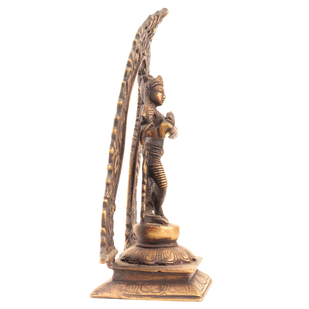 Hand Crafted Brass Standing Krishna. Statue with floral prabhavali in the background finely done to get that peaceful expression on the face. Brings Instant Peace At a Moment Glance. Fills the Atmosphere with Peace and Positive Energy. Handmade. It is More Than a Statement Piece.