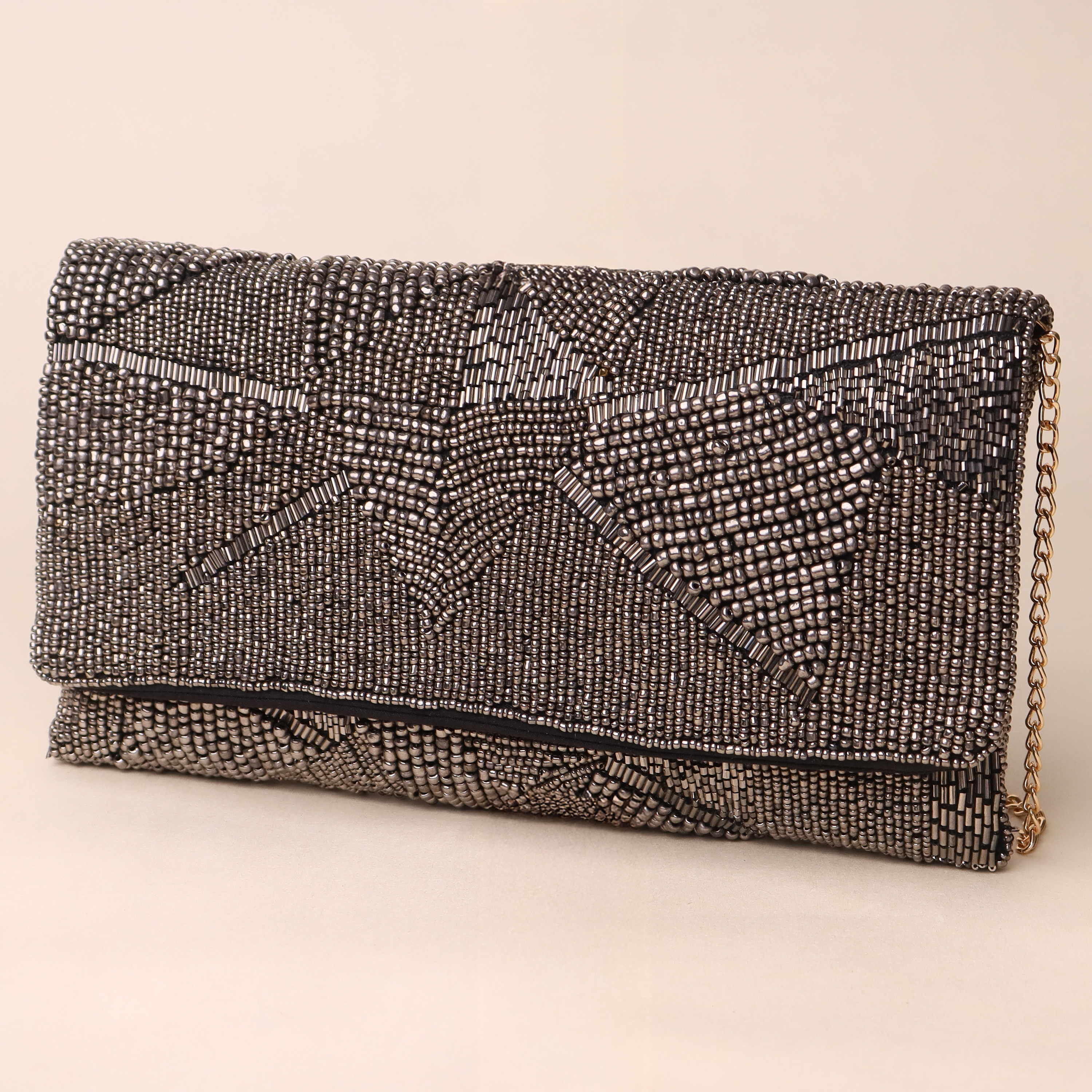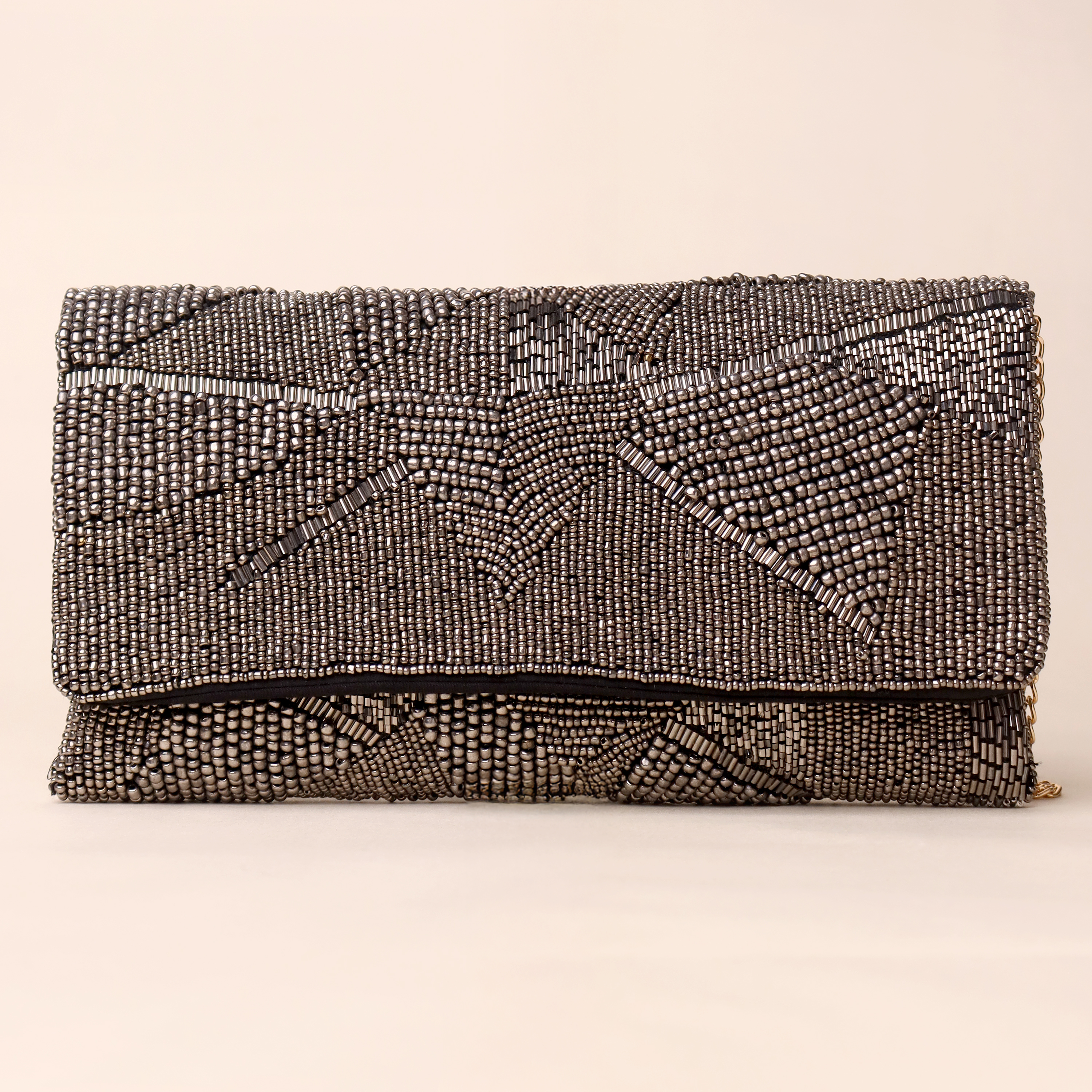 - Design Pattern: Abstract geometric pattern with metallic silver and black beadwork