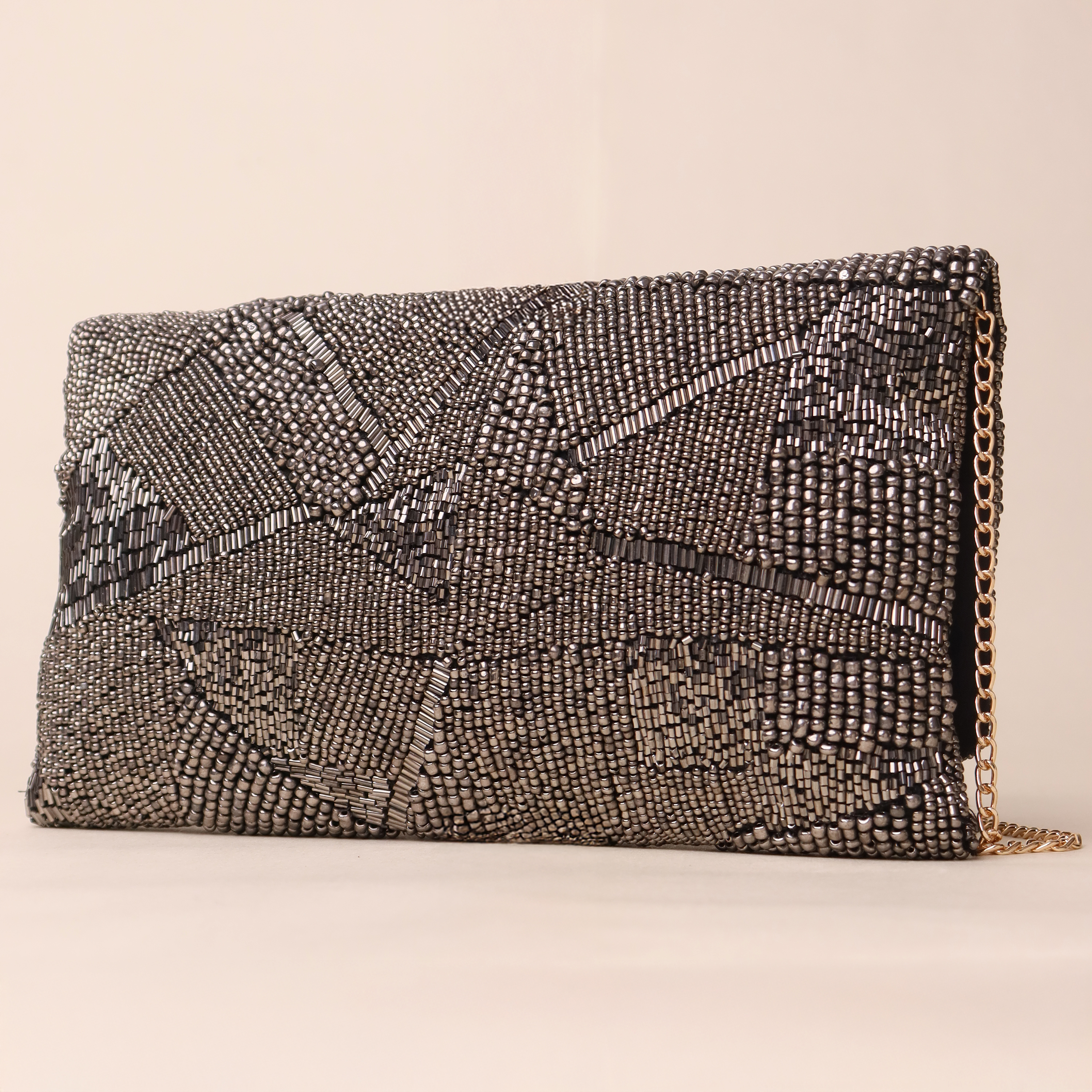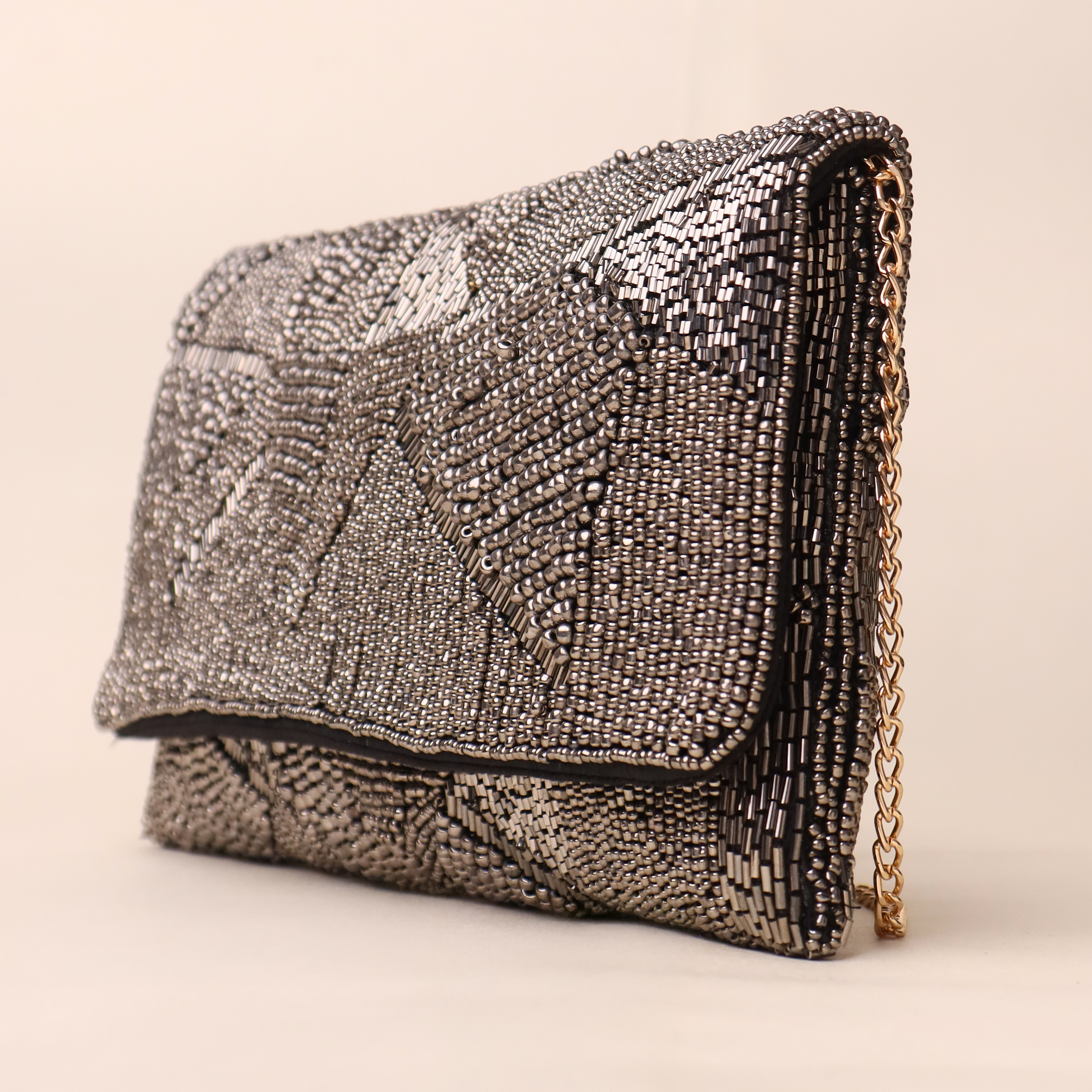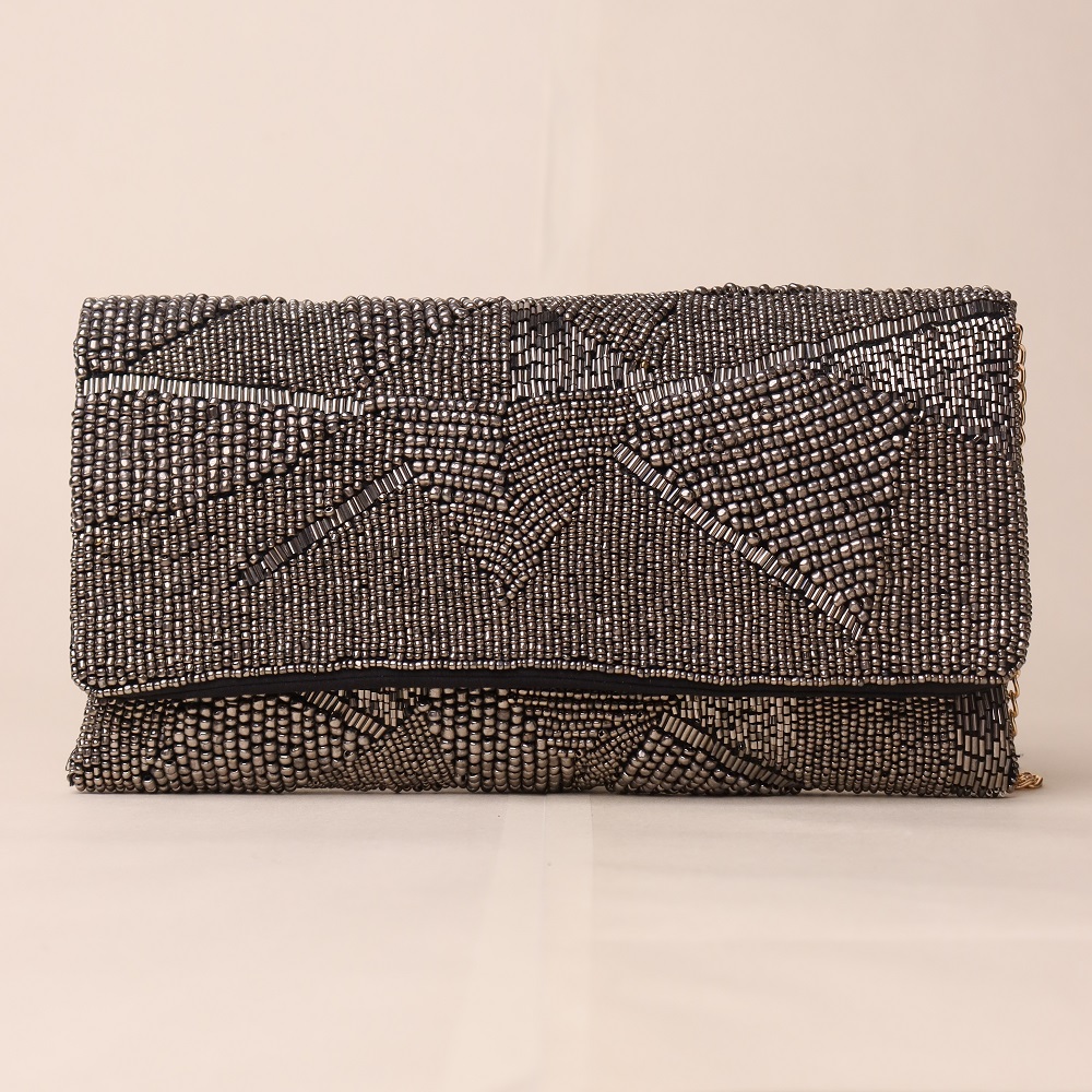 Embrace modern glamour with this stunning hand-beaded sling bag, featuring an abstract geometric design in metallic silver and black. The intricate beadwork creates a textured, starlit effect, making it a true statement accessory for evening outings and special occasions. The detachable gold-tone chain strap adds versatility, allowing you to wear it as a crossbody or shoulder bag, or carry it as a sleek clutch. Perfect for cocktail nights, weddings, and formal gatherings.