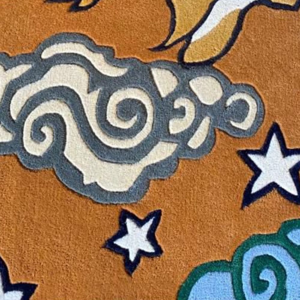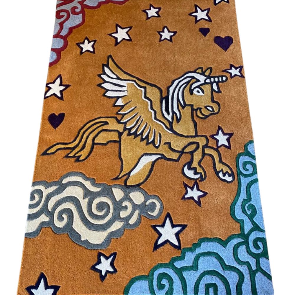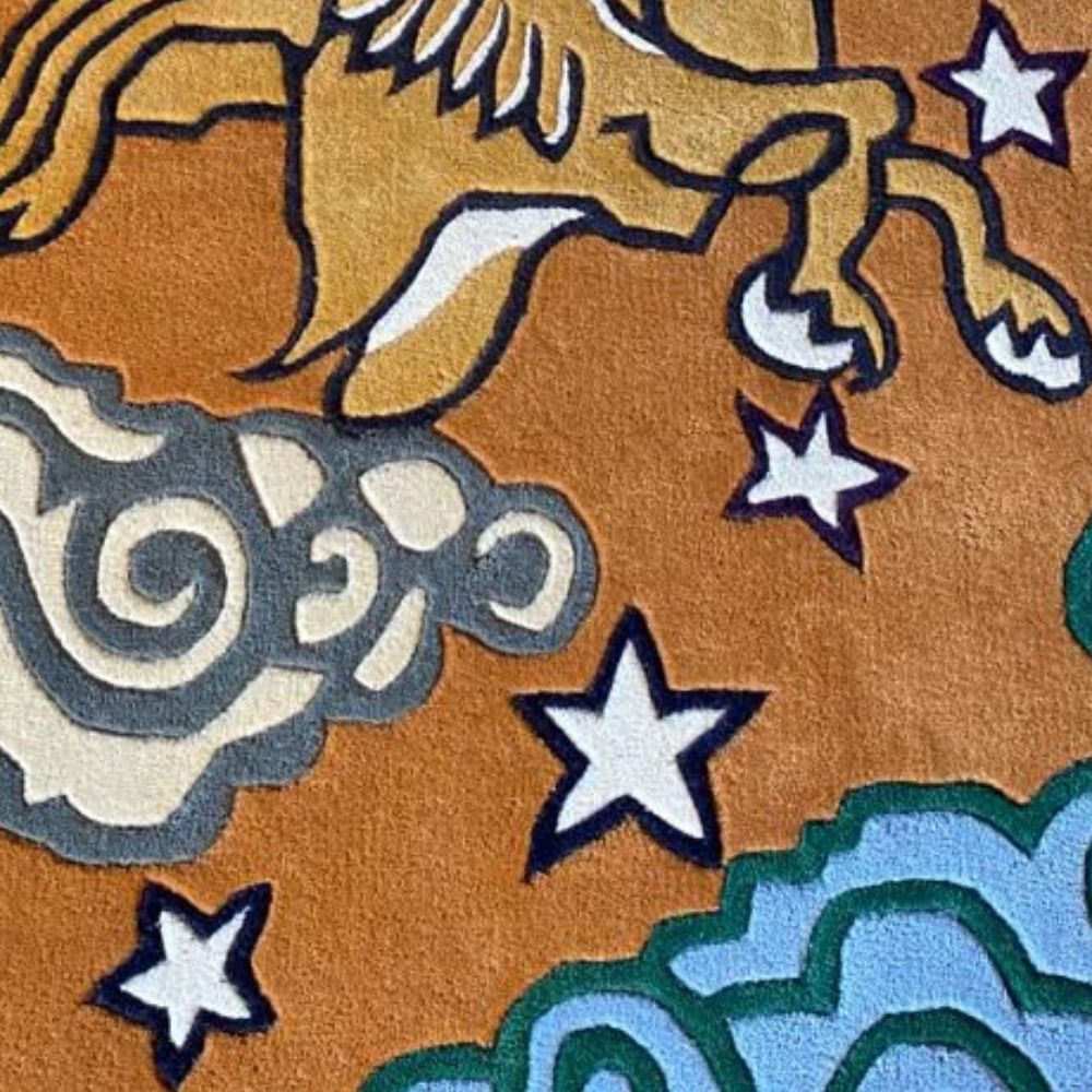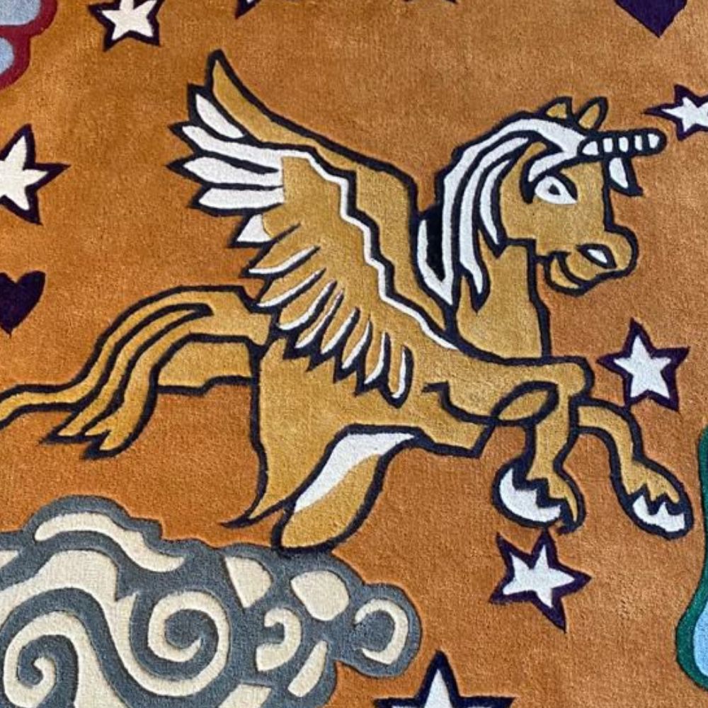 Bring magic to your space with this enchanting hand-tufted wool rug, featuring a whimsical winged unicorn (pegasus) design surrounded by stars, clouds, and vibrant accents. This rug captures the charm of a fantasy storybook scene, blending artistry with the cozy comfort of wool. The plush, textured pile adds warmth and character to any room, making it especially perfect for childrens bedrooms, playrooms, or anyone who loves imaginative dcor. Color Palette Golden Mustard (Base): The dominant background shade, warm and grounding, providing a dreamy sunset-like effect. White & Cream (Clouds & Stars): Adds brightness, contrast, and a sense of airiness to the design. Deep Plum (Stars & Hearts): A bold, romantic accent that brings depth and highlights. Teal Green (Cloud Swirls): Creates a lively, nature-inspired contrast with fresh energy. Dusty Silver & Light Gray (Cloud Details): Soft, neutral tones that balance the brighter shades. Warm Camel & Ochre (Unicorn Body): Classic earthy tones with white detailing to emphasize the unicorns wings and features. Together, these colors create a magical and playful palette that is visually engaging yet balanced for long-lasting appeal.
