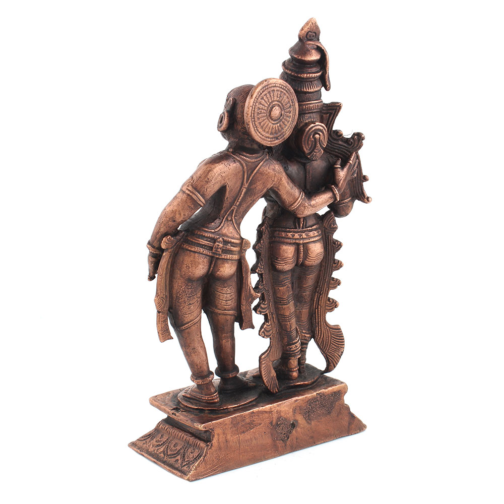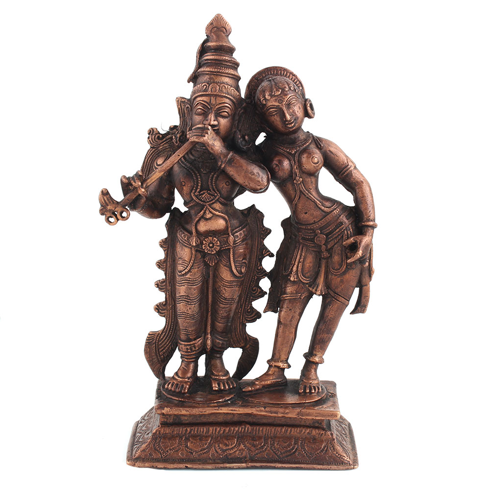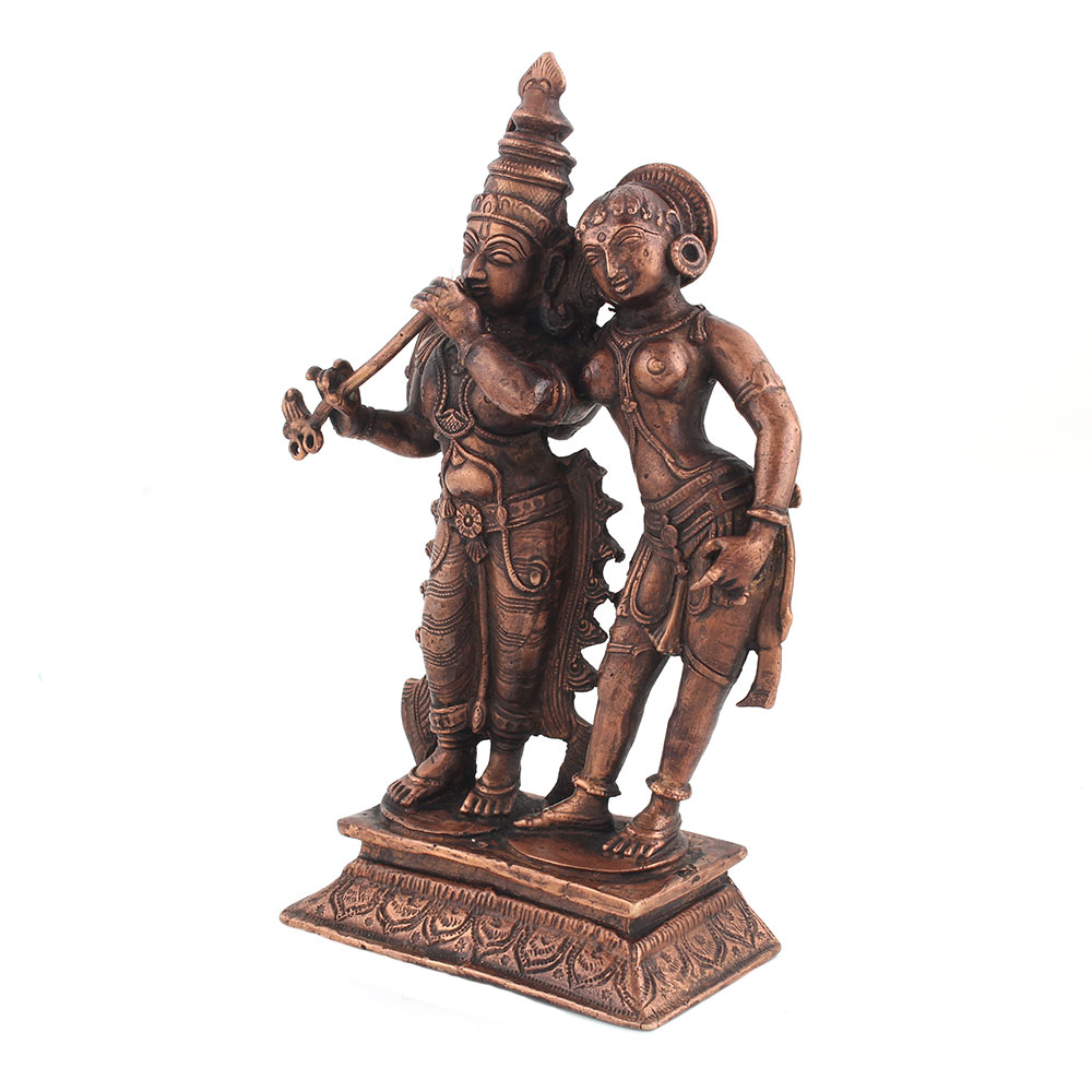 A beautiful copper statue of Lord Krishna playing flute alongside Goddess Radha. RadhaKrishna, together are considered as the highest form of divine and unconditional love.