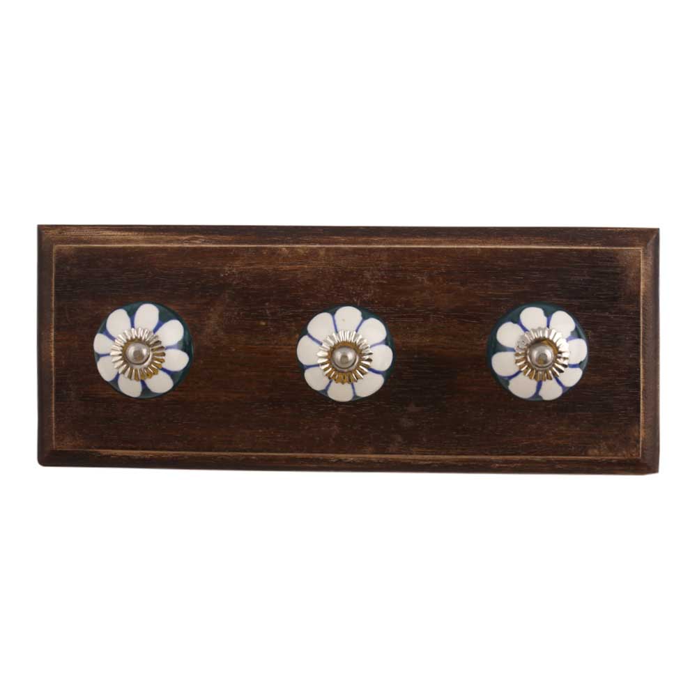 Stephanotis Ceramic Wooden Hook. A Perfect Complement to the Soft Tone of the Wood are these White Traditional Hat & Coat Hook Made of Genuine Porcelain and Brass. It can be use to Hang Jewellery, Leashes, Towels, Scarves, Light Weight Sweaters, Caps Etc.