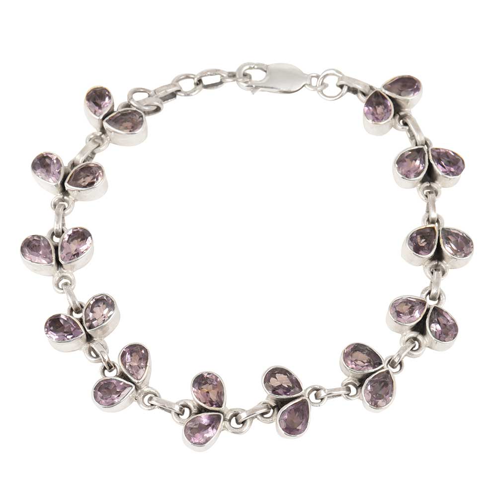 This beautiful bracelet showcases tear drop shaped royal purple color amethyst gemstones bezel set in sterling silver designer chain frame. Perfect for the Festive Season or a Christmas gift.