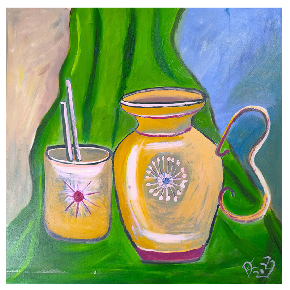 This vibrant oil painting on stretched canvas brings a refreshing modern perspective to traditional still-life art. Featuring a rustic yellow jug and tumbler, the composition captures the charm of everyday Indian utensils through bold brushstrokes and stylized form. The central objects are adorned with delicate floral burst motifs, rendered in soft pastels that stand out beautifully against the rich ochre tones. A fluid green backdrop adds depth and motion, while cooler shades of blue and beige balance the warmth of the vessels. The exaggerated curves of the jug’s handle and the playful outlines reflect a fusion of realism and abstraction, making the scene feel both familiar and imaginative. Crafted with rich oil pigments on high-quality stretched canvas, this piece exudes texture, vibrancy, and a touch of nostalgia. Whether displayed in a kitchen, dining space, or gallery wall, this artwork evokes the quiet elegance of everyday life with a contemporary, expressive flair.
