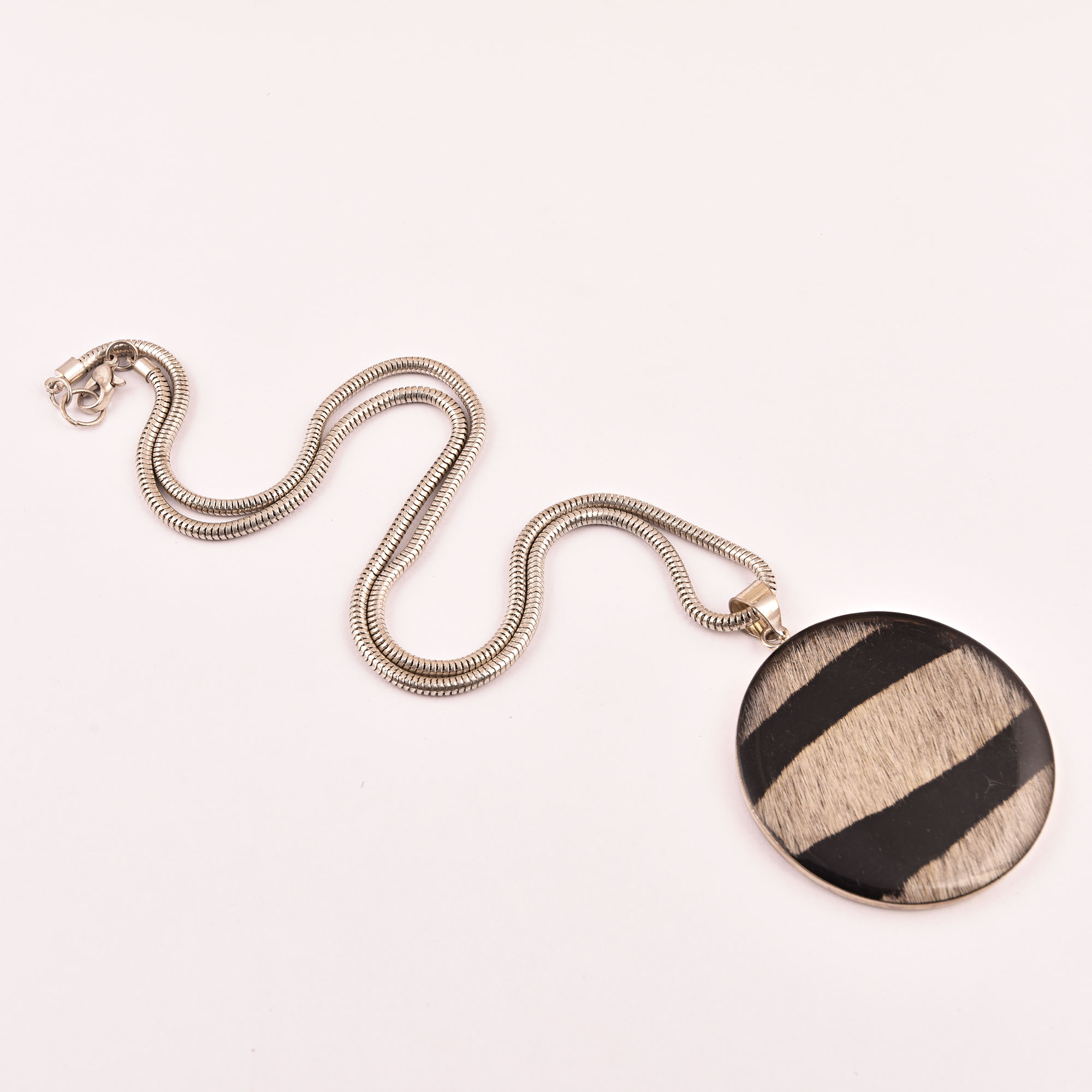 Striped Pendant Necklace New Beautiful Jewellery. Leather, Glass with Snake Chain in Brass with a Clasp .