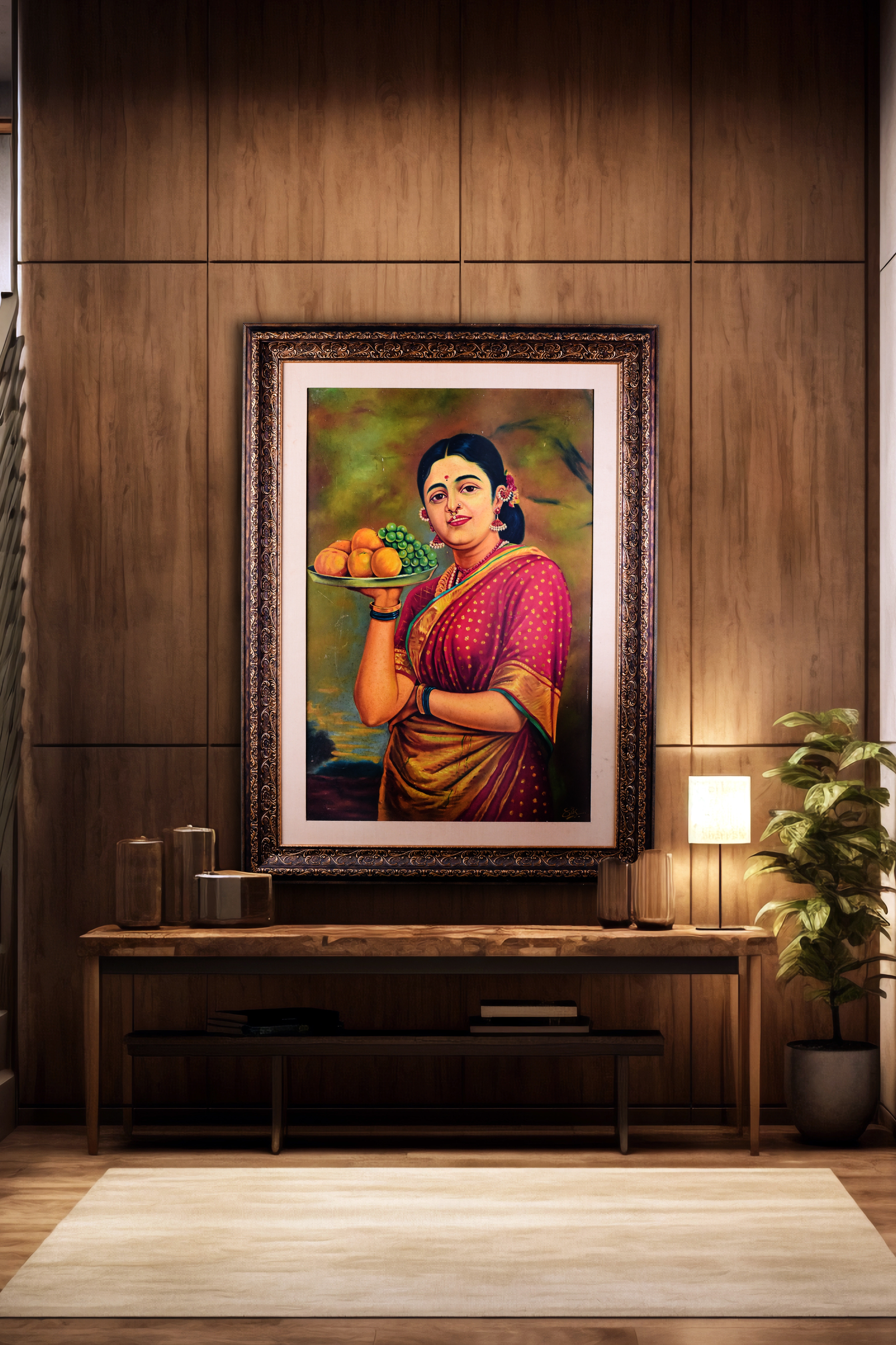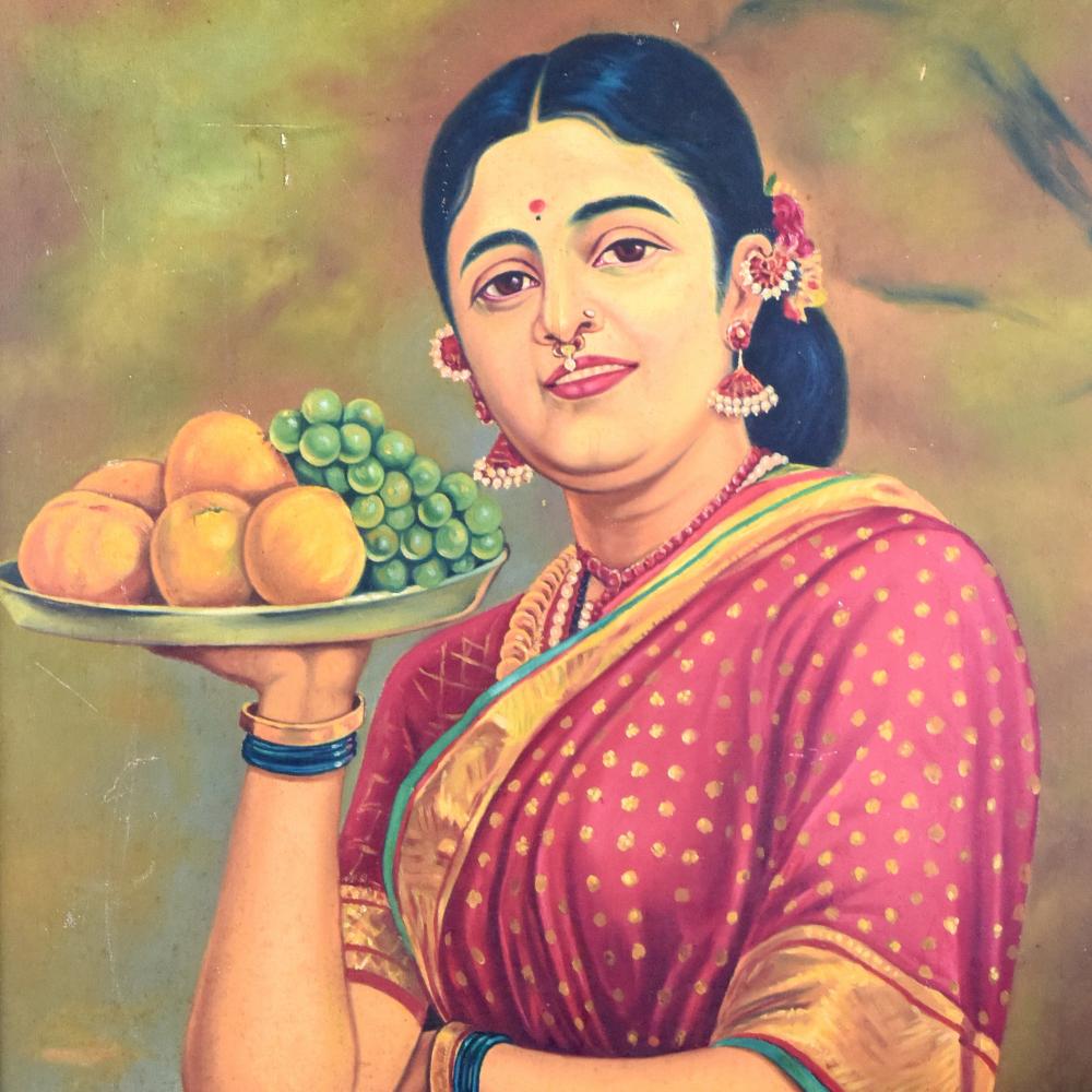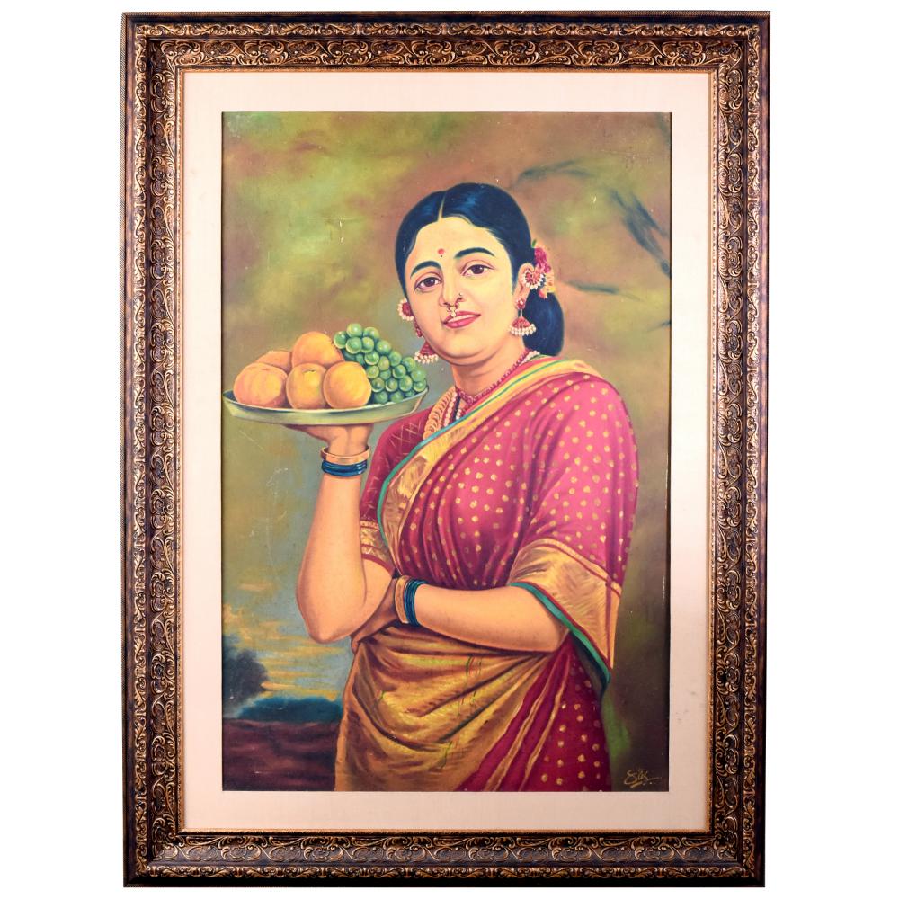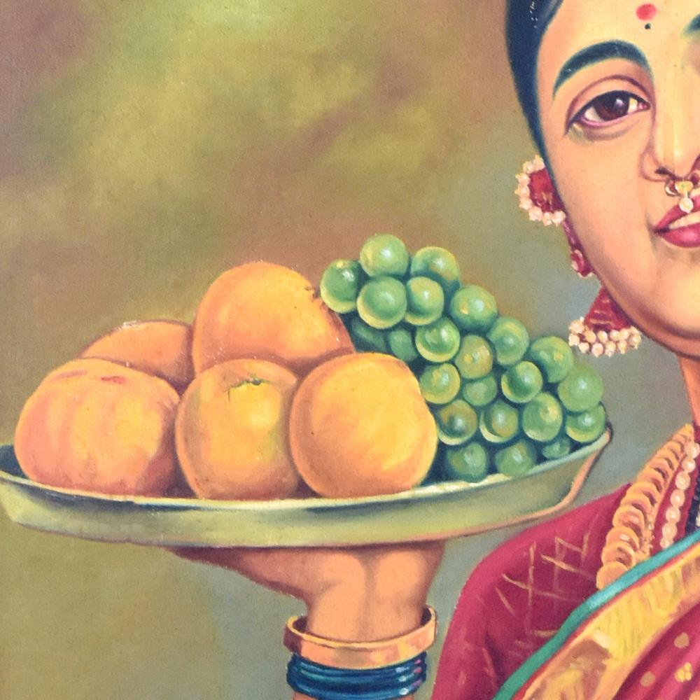 - Depicts a woman holding a bountiful fruit plate