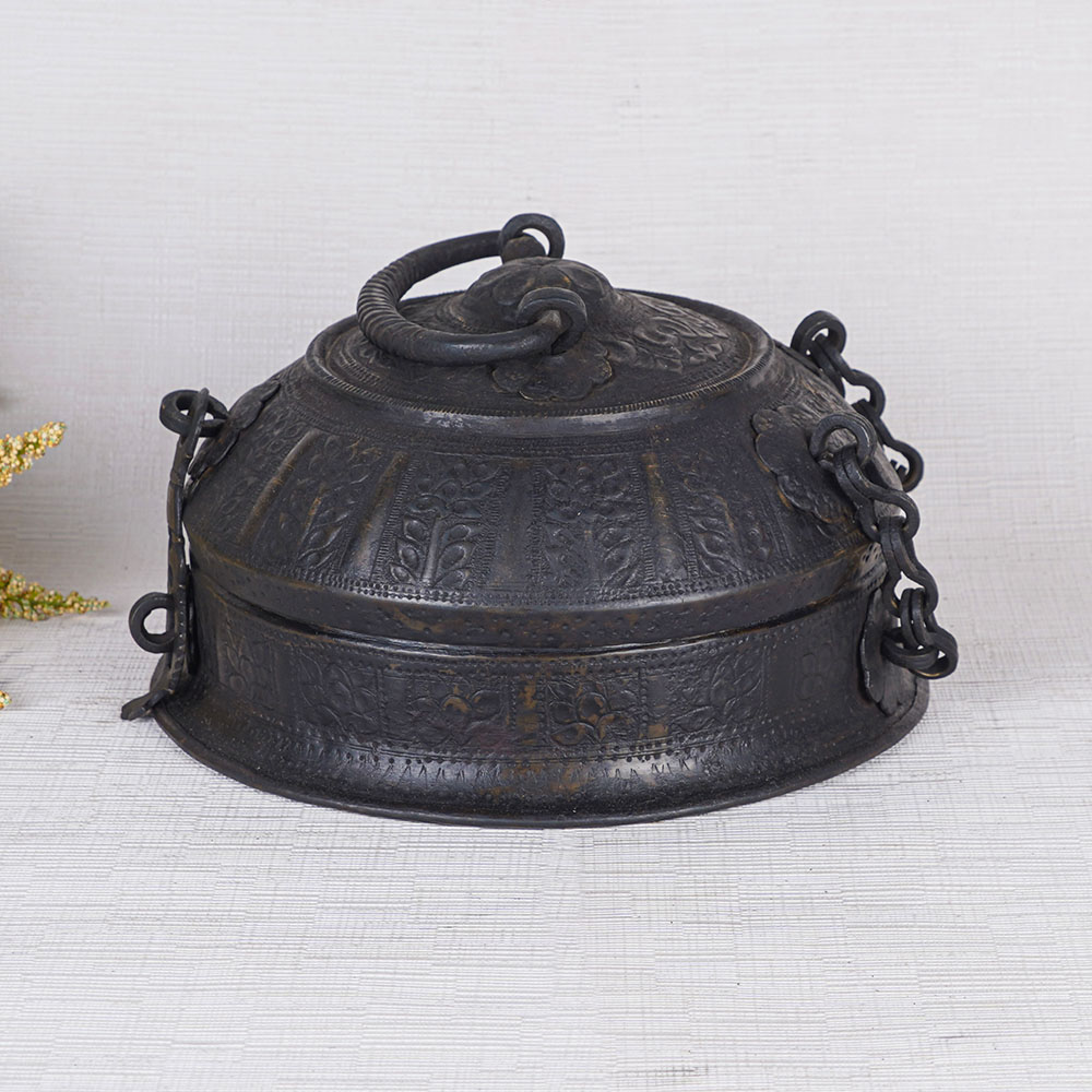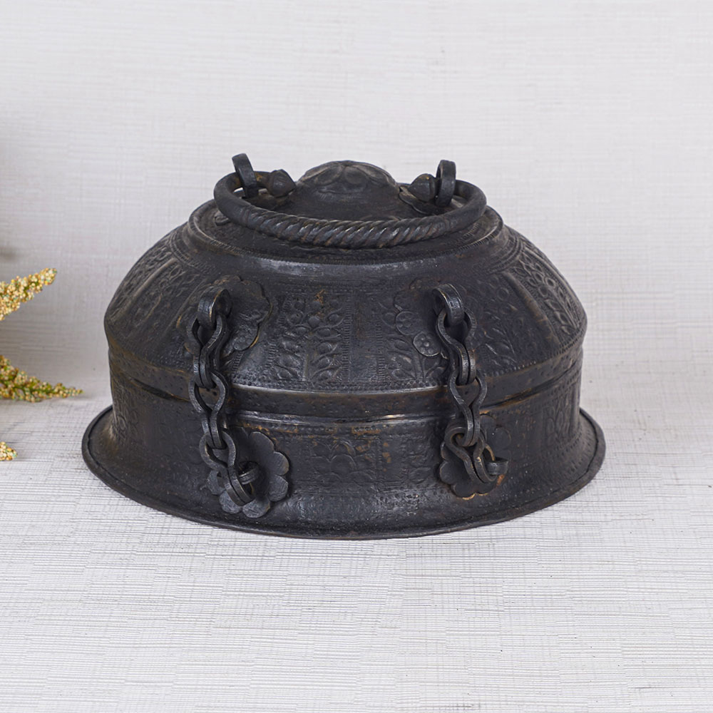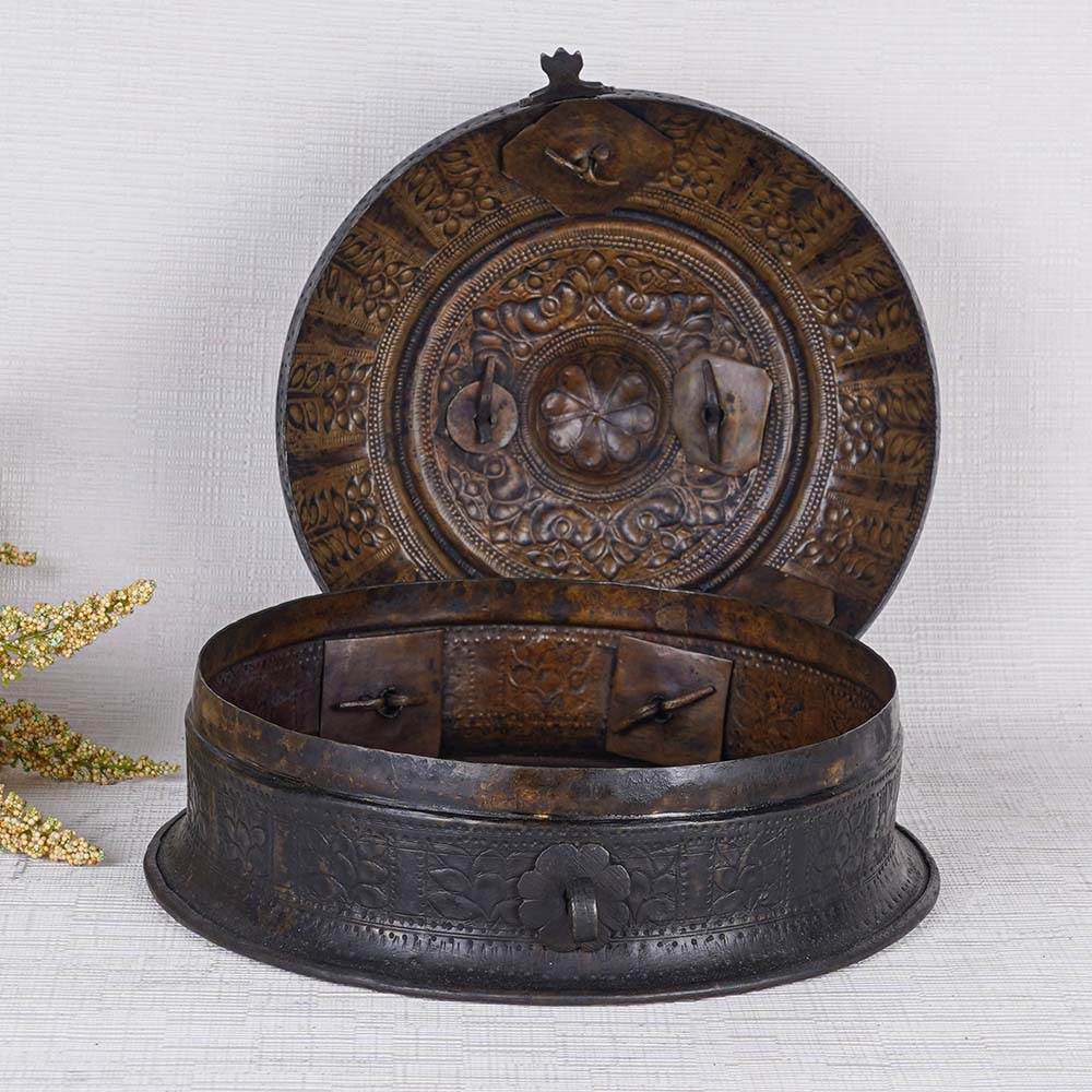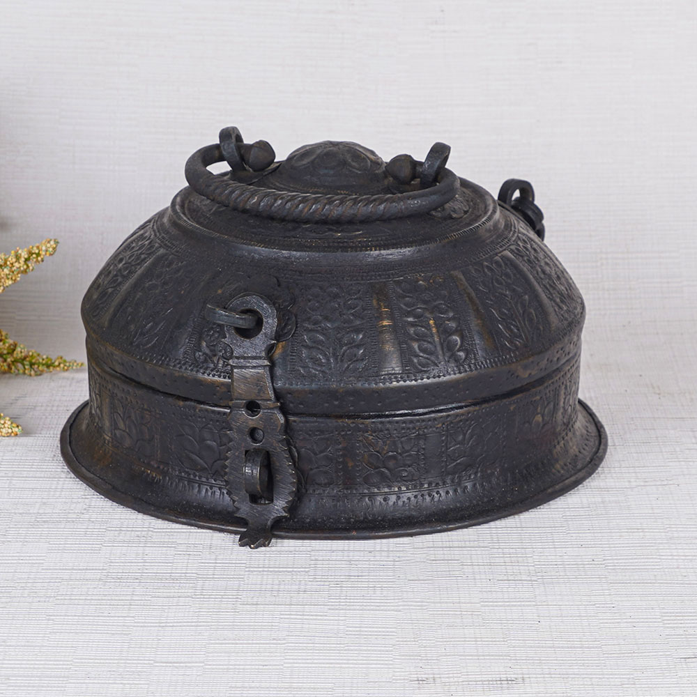 Buy a sturdy brass jewelry box, a true masterpiece of artistry and craftsmanship. Handcrafted by skilled Indian artisans using traditional methods, this jewelry box is a testament to their dedication and expertise. Made from high-quality brass, it boasts a sleek black finish that exudes elegance and sophistication. Designed to safeguard precious items and jewelry, this versatile box has evolved to serve as a stylish storage solution for modern times. The box is adorned with intricately engraved designs, adding a touch of timeless beauty to its already captivating appearance. With a secure latch and a convenient handle on the top, it offers both protection and portability. This jewelry box is not only a practical storage accessory but also a stunning decorative piece suitable for any setting, be it a home, office, restaurant, or hotel. Its aesthetic appeal makes it an ideal display item for exhibitions or museums, captivating the eyes of all who behold it. Furthermore, this brass round jewelry box makes for a perfect gift on special or festive occasions. Whether it's a women's jewelry box, a black jewelry box, or a jewelry gift box, it is sure to delight your family, friends, or loved ones. Embrace the timeless beauty of this remarkable creation and cherish your precious belongings in style.