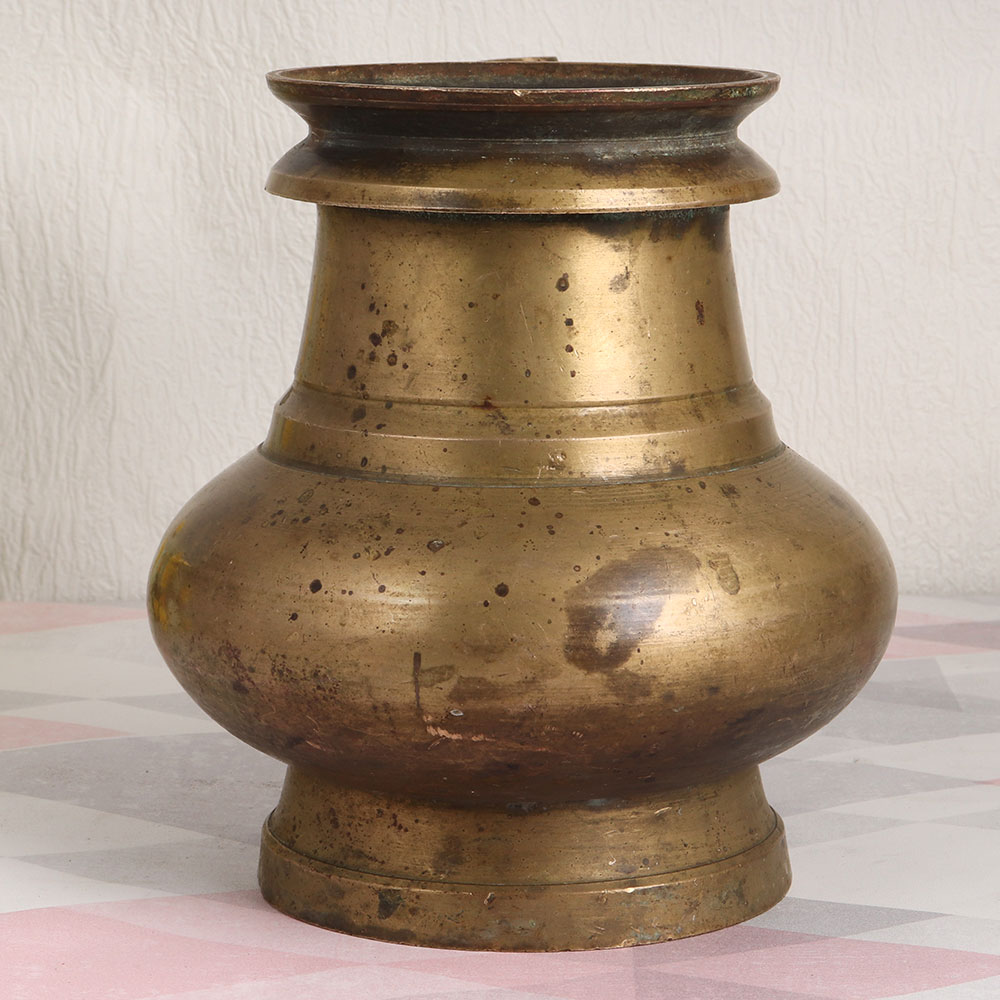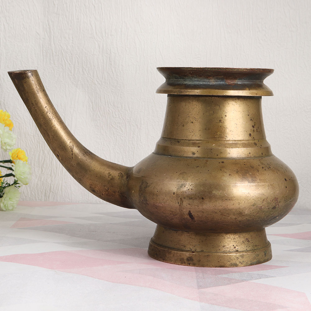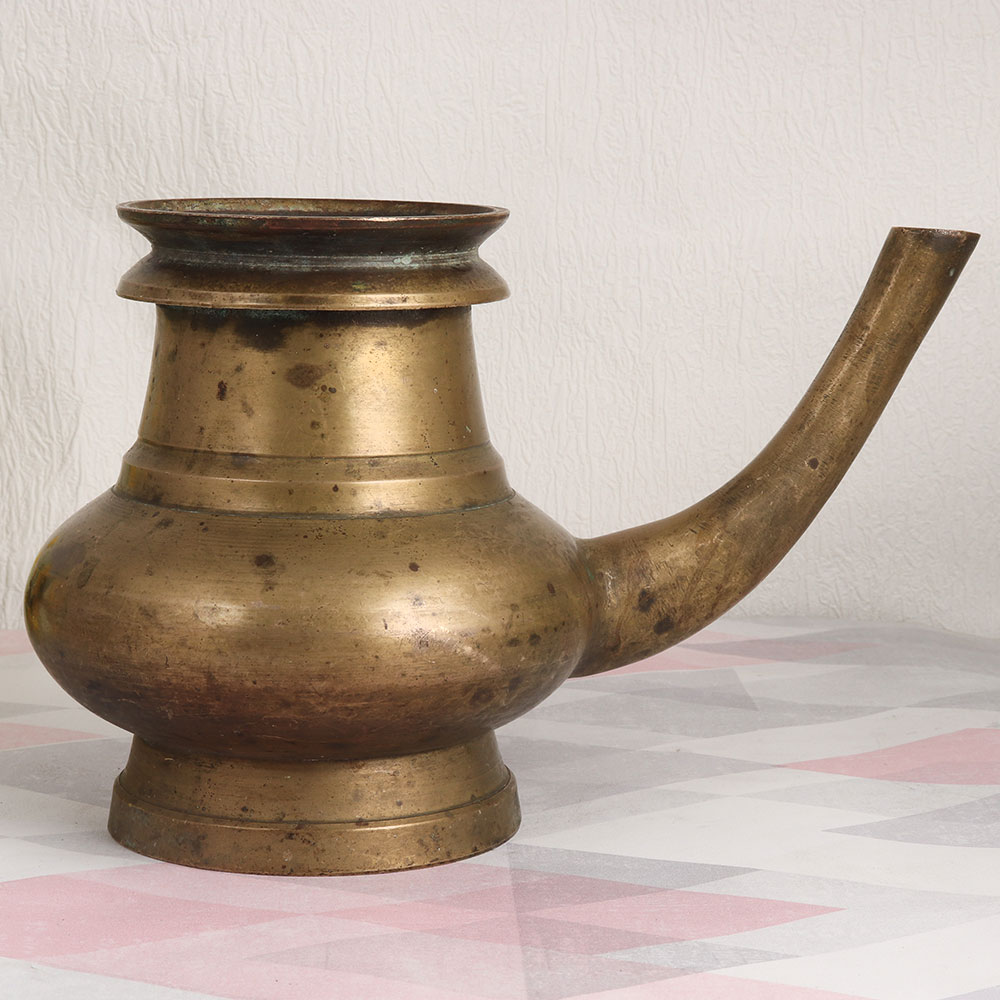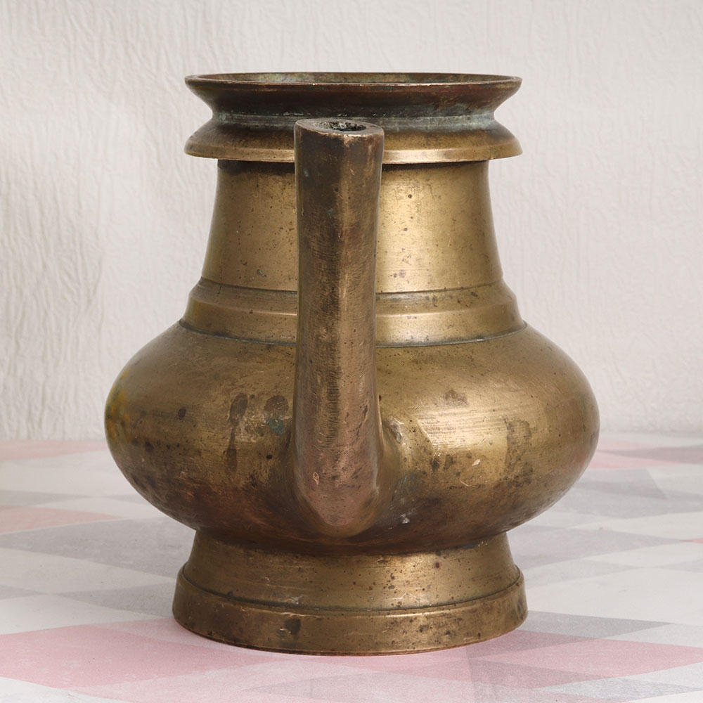 Enhance your living space with a touch of timeless elegance and spiritual significance through this exquisite Vintage Brass Holy Water Pot. Handmade by skilled Indian artisans using the traditional techniques of South Indian art, this piece is a testament to their craftsmanship. Crafted from high-quality brass, the antique brown finish adds an aura of rustic charm, making it a versatile addition to any setting. Whether you place it at home, in your office, a restaurant, hotel, cafe, or shop, this pot doubles as an indoor flower vessel, adding a graceful touch to your decor. But its purpose extends beyond aesthetics. This holy water pot is designed to serve in sacred rituals, havans, and other auspicious occasions, making it a cherished part of your religious practices. It offers the perfect means to dispense holy water to devotees, symbolizing purity and blessings. As an exquisite antique piece, it's a valuable addition to any vintage collection, and it makes for an ideal gift for your family, friends or relatives on special, festive, or auspicious occasions.