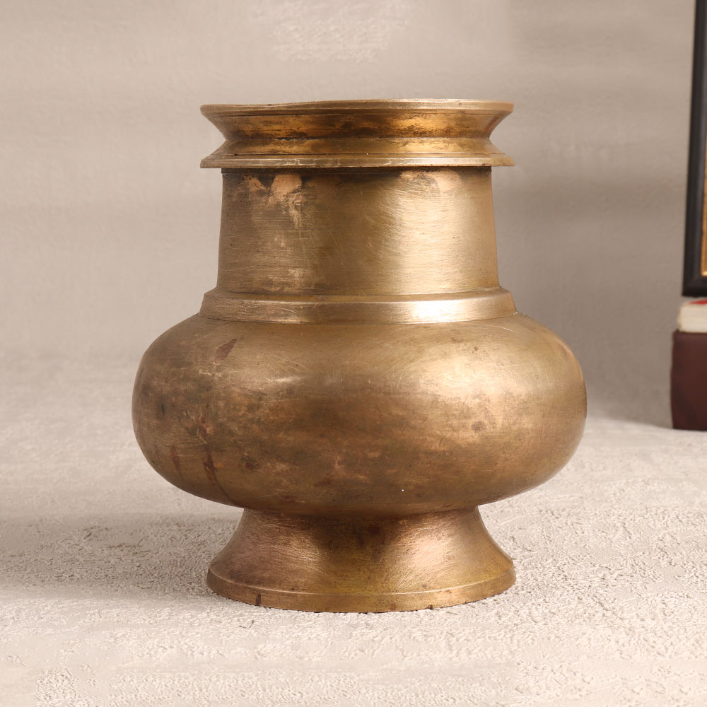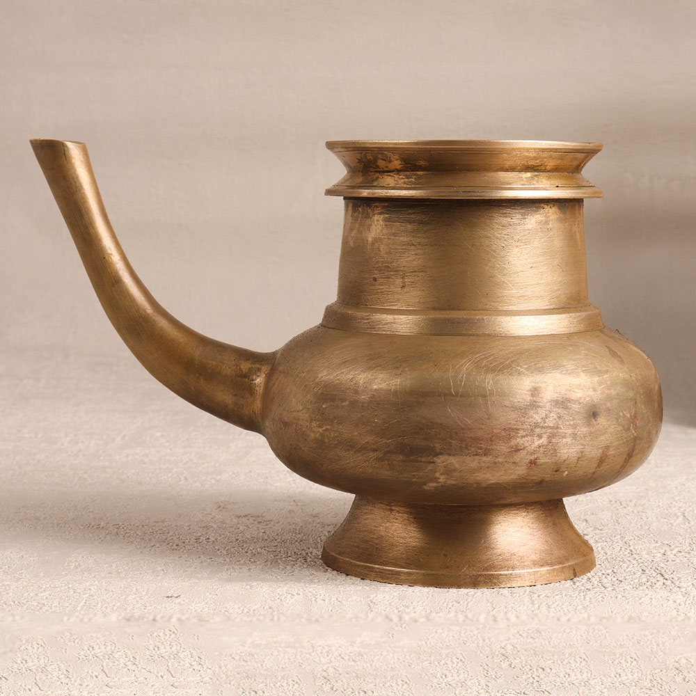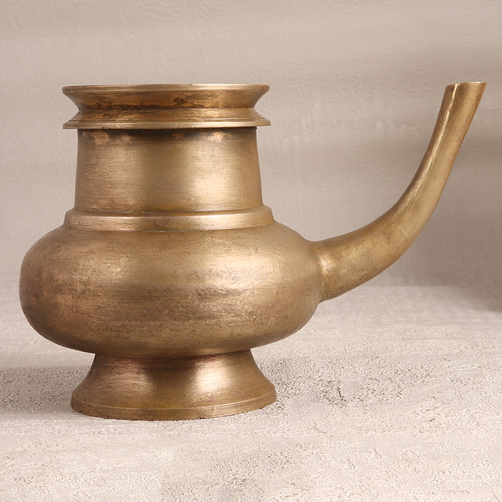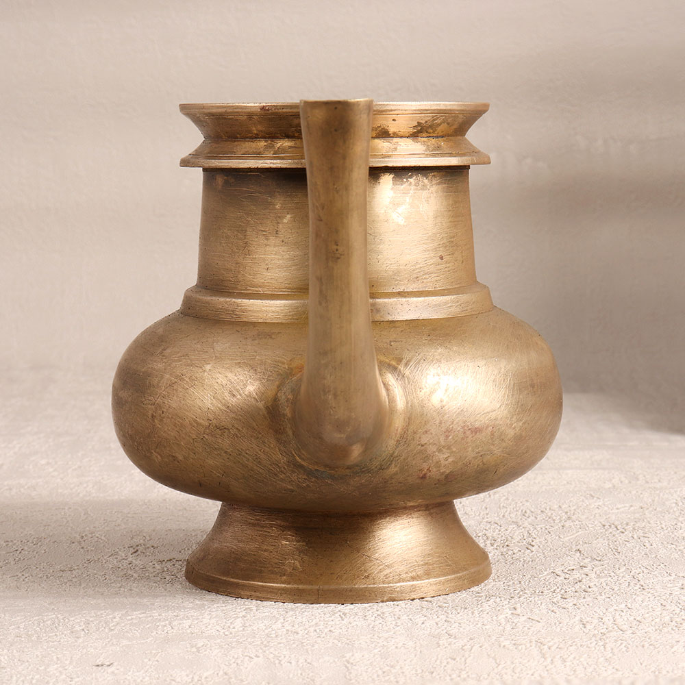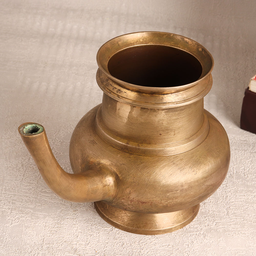 Adorn your spiritual space with the timeless elegance of the Vintage Brass Holy Water Pot which is affectionately known as the Sagar Pot. Handcrafted by skilled Indian artisans in the revered South Indian Art tradition, this pot is a masterpiece in antique brown finish brass. Its graceful design and intricate detailing transport you to an era where craftsmanship was an art form. Traditionally used during prayer to hold holy water, the Sagar Pot is a symbol of sanctity and reverence. Its versatile spout allows for precise pouring, adding a touch of ritual to your sacred moments. Beyond its spiritual significance, this pot serves as a stunning vessel for flower decoration, exuding an aura of sophistication. Made from high-quality brass, the pot promises durability and a rich, authentic aesthetic. Whether adorning your home, office, restaurant, hotel, or cafe, this piece seamlessly integrates into any space, turning it into a haven of serenity. A thoughtful addition to any vintage collection, it makes for an exquisite and meaningful gift for your family, friends or relatives on special, festive, or auspicious occasions.