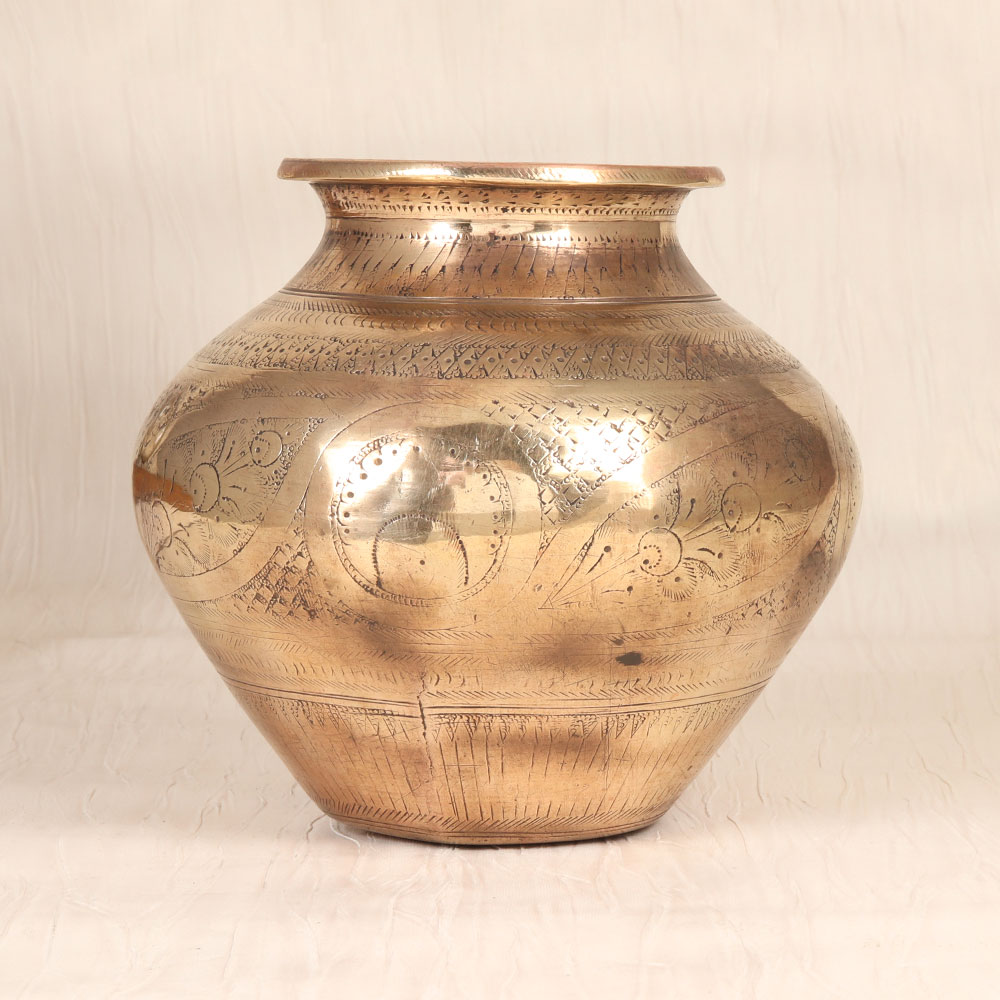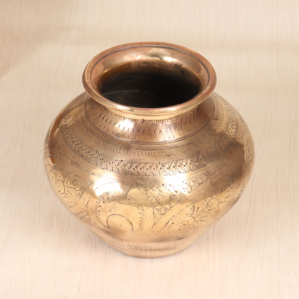 Infuse your daily rituals with the timeless beauty and spiritual energy of this vintage brass holy water pot. Meticulously crafted by skilled artisans in the renowned Gujarat region of India, this sacred vessel features intricate carvings that echo the ornate designs found in ancient temples. The solid brass construction ensures exceptional durability and a luminous shine that will only deepen with age, making this holy water pot a cherished heirloom to be passed down through the generations. Whether you're looking to elevate your personal meditation practice or seeking a stunning centerpiece for your home altar, this holy water pot is a must-have for the spiritually-inclined. Fill it with blessed water and use it to purify your sacred space, anoint your forehead, or simply admire its timeless elegance as you center yourself in the divine. Upgrade your rituals and transform your environment with the grounding, uplifting presence of this exquisite brass vessel, and experience the blessings of ancient India in your own home.