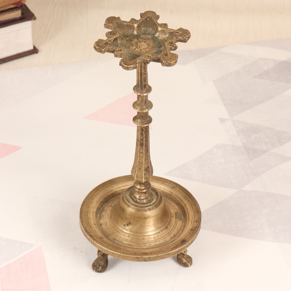 - Intricate South Indian motifs etched into the solid brass body