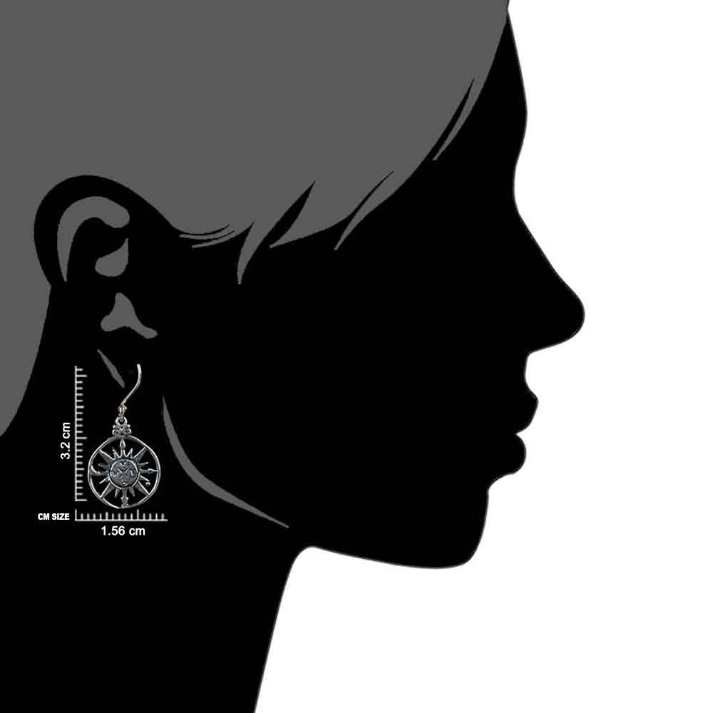 Sun design with different symbols engraved 92.5 Sterling silver earrings in a perfect circular border is an example if expert craftsmanship. Wear it to a cocktail, interview, social gathering, graduation day etc. Gift it to your friends and relatives o birthdays, anniversaries or functions.