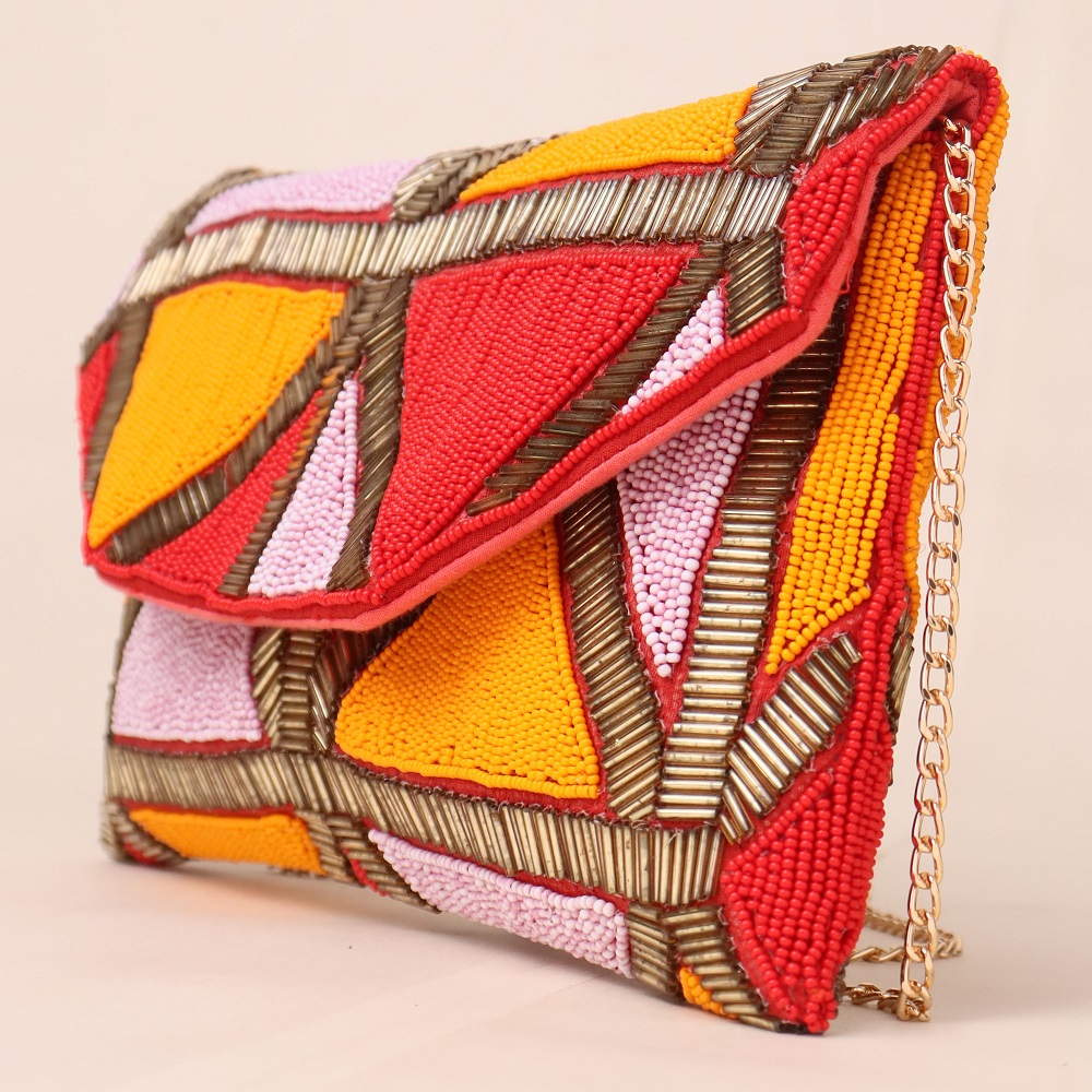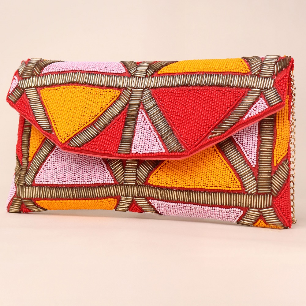 Infuse your ensemble with radiant energy through this striking mosaic-style clutch. Featuring a vibrant pattern of triangular beadwork stitched with geometric precision, this handcrafted piece is a celebration of color and bold artistry. The fold-over envelope design offers timeless appeal, while the addition of a detachable chain strap allows for versatile styling—carry it as a clutch or wear it crossbody for effortless flair.