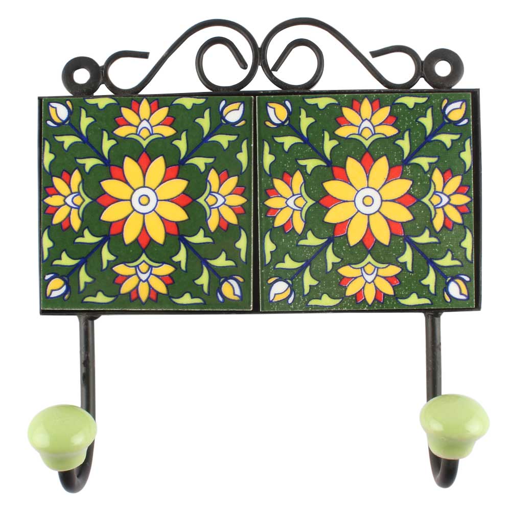 Sunflower Ceramic Tile Hook With Forest Green. When Put on Wall or Cabinet It is An Art in Itself. The Metal Part of this Hook is Black Powder Coated.