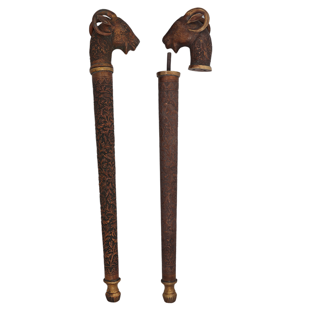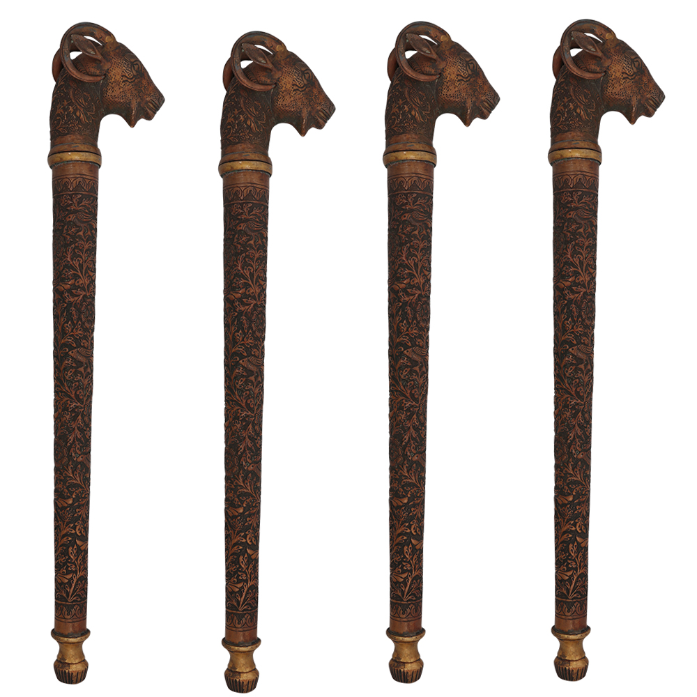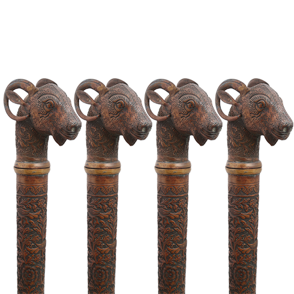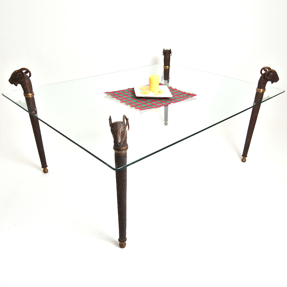 Big horn sheep table legs in copper meticulously hand carved and enameled with granular texture throughout with fine foliate or ornamentation featuring leaves and flower.