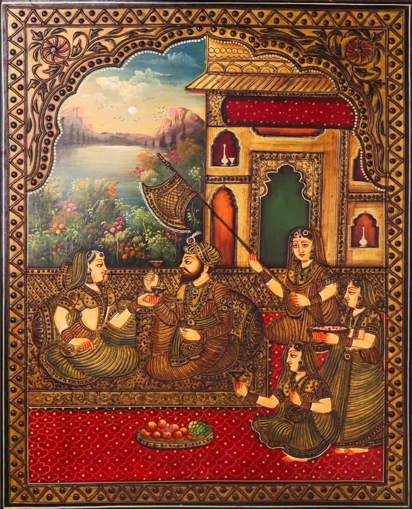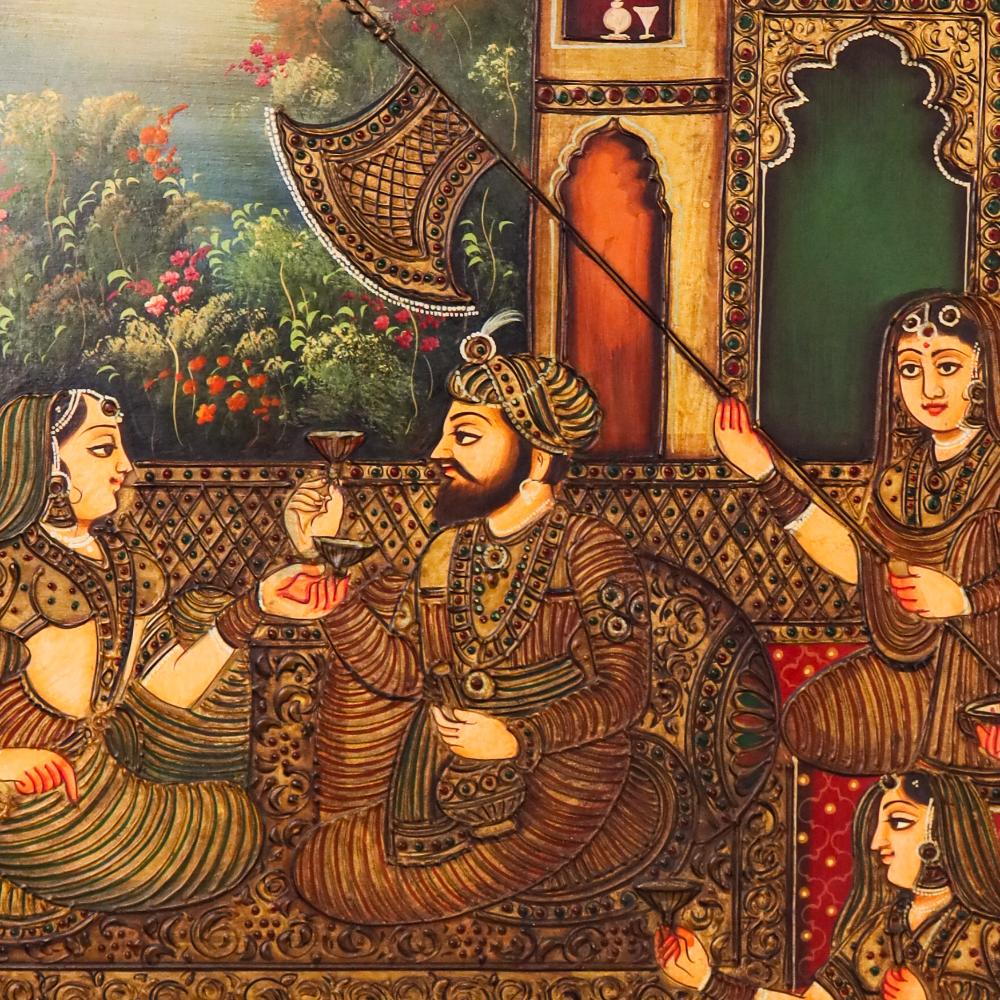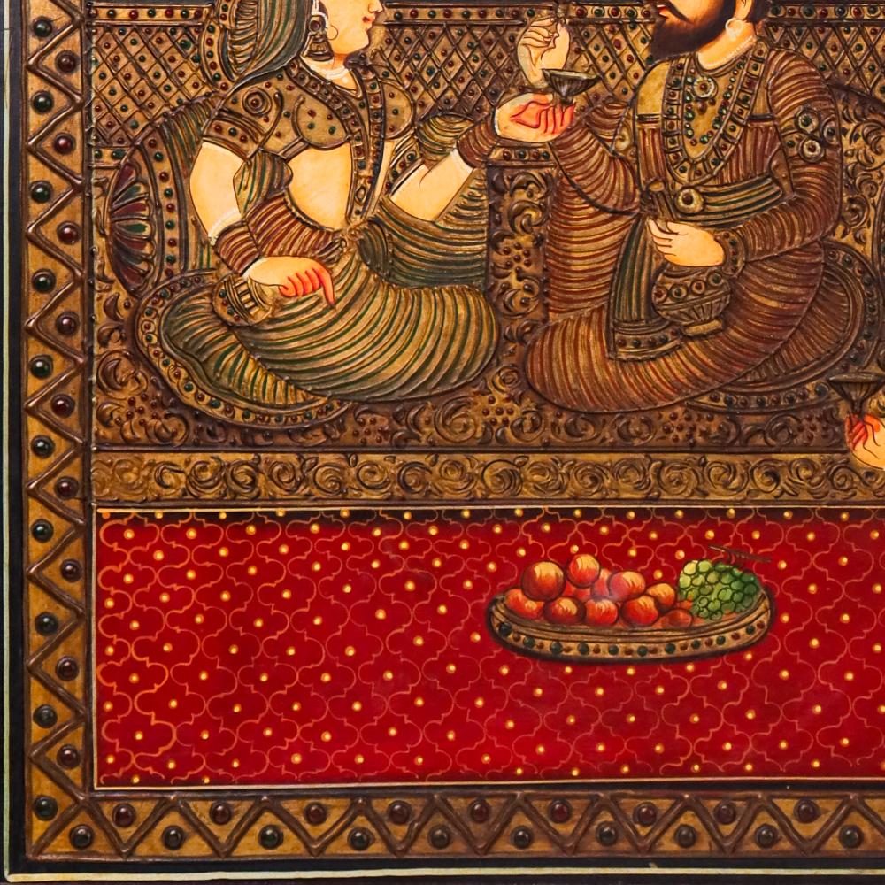 Step into a regal moment frozen in time—this Tanjore painting tells a story of royalty, devotion, and elegance. With the king and queen seated amidst a luxurious court, every brushstroke captures the quiet opulence of their world. A golden twilight glows in the background as attendants fan and serve, while fruits and wine symbolize abundance and festivity. Hand-painted on board and treated with an antique finish, this piece does more than decorate—it narrates a timeless cultural saga.