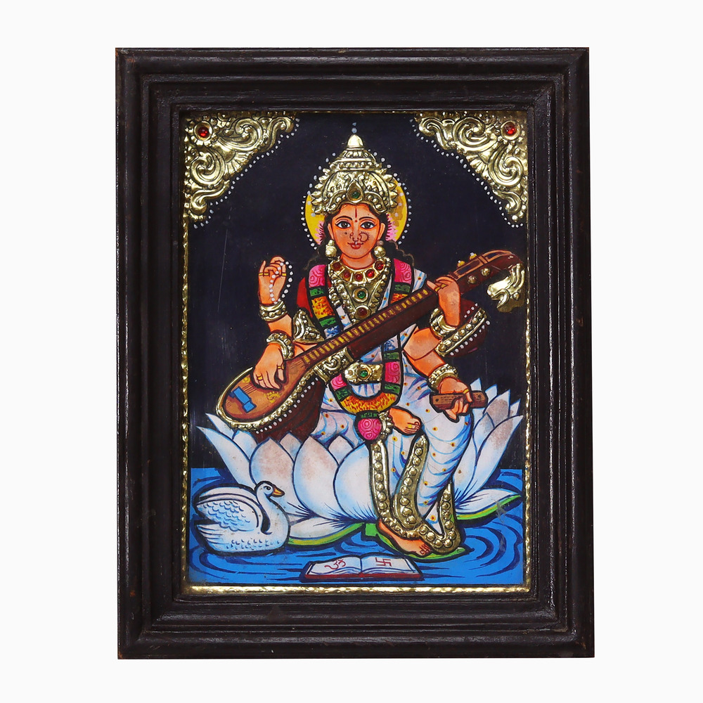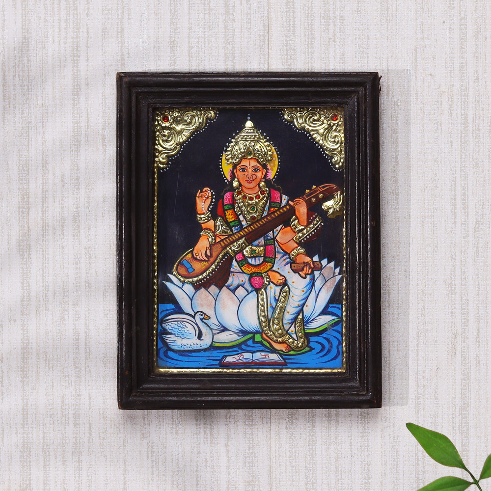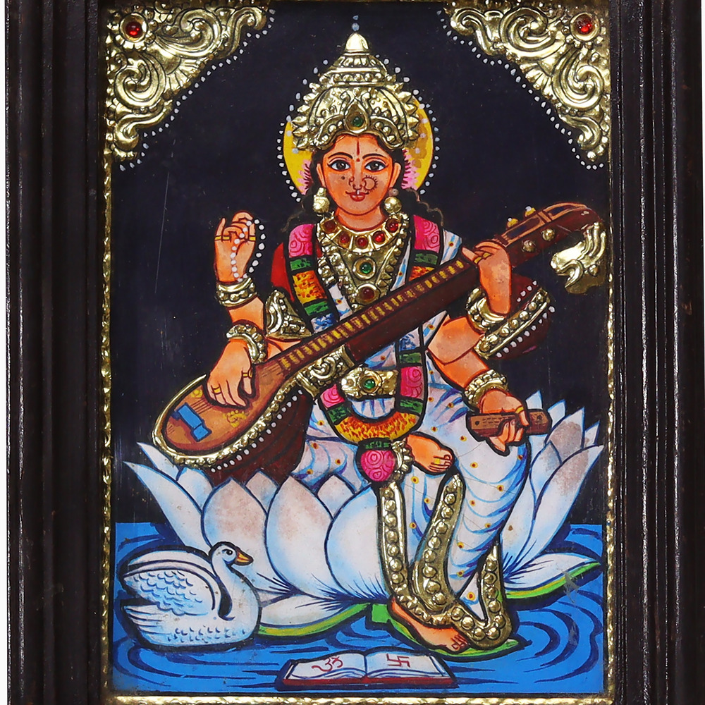 Infuse your sacred space with the transcendent beauty of the Goddess Saraswati through this exquisite Tanjore painting. Meticulously crafted with intricate gold detailing, this vibrant depiction of the divine feminine will captivate all who behold it. As you gaze upon this sacred artwork, feel your mind calm and your spirit soar. Saraswati, the Goddess of wisdom, music, and the arts, bestows her blessings upon all who honor her. Let this painting be the centerpiece of your meditation practice, igniting your connection to the divine feminine and inspiring your spiritual growth. Whether displayed in your home shrine, yoga studio, or personal sanctuary, this Tanjore Saraswati painting will transform your environment into a haven of tranquility and inspiration. Surround yourself with the Goddess' serene energy and experience a deeper sense of clarity, creativity, and inner peace. Invite the gifts of knowledge, self-expression, and spiritual enlightenment into your life with this stunning sacred artwork.