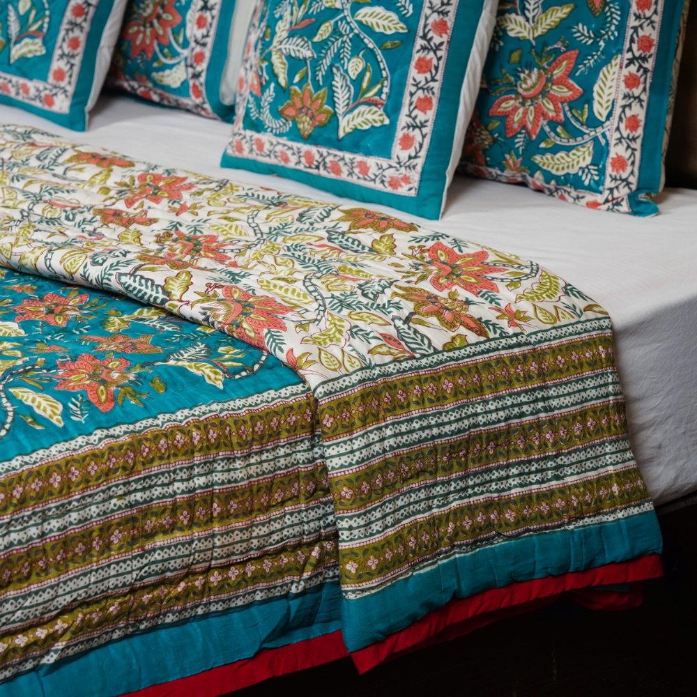 This teal multicolor Malmal (Voile) quilt radiates sophistication with its lush floral hand-block prints and earthy undertones. Made from soft cotton voile, it combines the lightness of traditional Indian fabric with modern elegance. Expertly handmade and quality-checked by Indianshelf to ensure unmatched craftsmanship and authenticity.