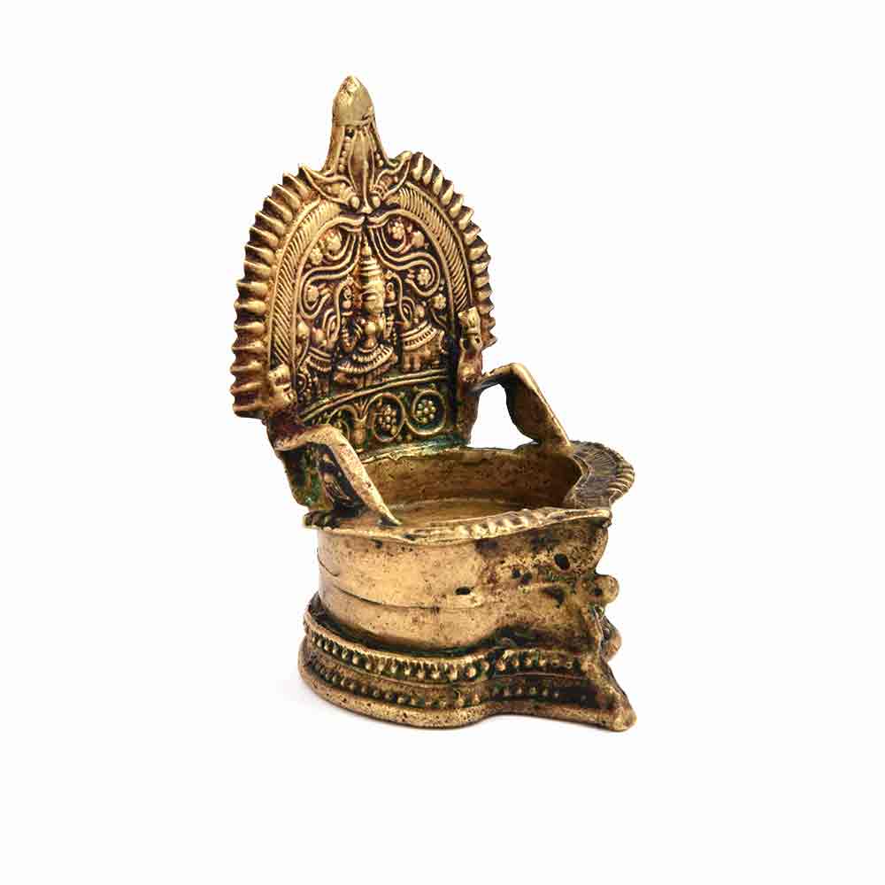 Temple bronze oil lamp with laxmi, kalash and flowers on both the side. It is made by lost wax process. Adds spiritual flavour to your decor. Vegetable oil, mustard oil or desi ghee can be used to light the lamp with cotton wicks.