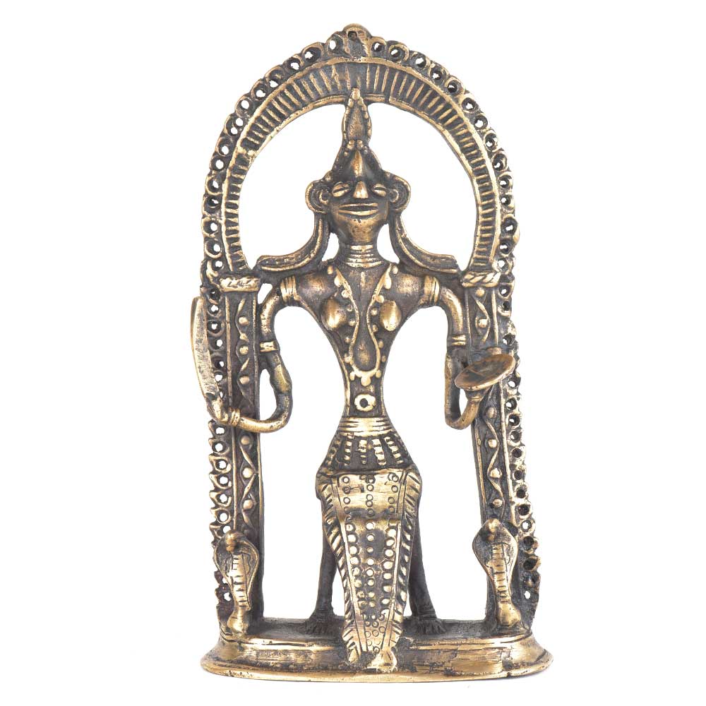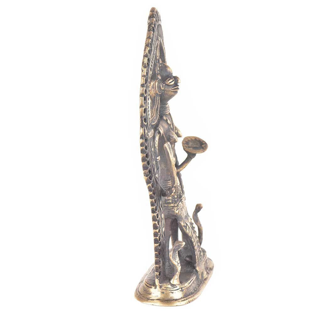 Handmade tribal godess is made by the tribal artisans . It is a temple statue and used for worshipping by the local tribals.Two cobras are seen in the arch where the snake god stands. The statue can be used as vintage collective item used for display. Use it as a gift for friend or relatives or just to add to your vintage collection .
