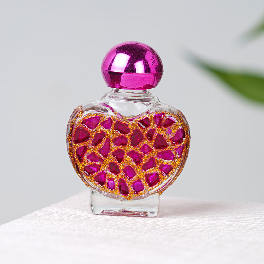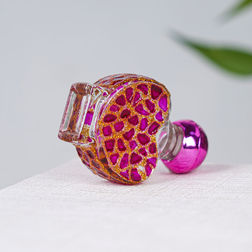 A glass bottle that is truly a masterpiece of Indian craftsmanship. The bottle is made by highly skilled craftsmen and features a mesmerizing design of golden sparkles carved into the pink-tinted glass. The bottle is finished with a delicate pink knob that can be used to securely close the bottle. This unique perfume bottle is not only a functional vessel for holding perfumes or oils but also serves as a beautiful decorative piece that can be displayed on a table or shelf. The intricate design of the golden sparkles adds a touch of elegance and sophistication to any room. This glass perfume bottle is the perfect gift for someone special, whether it be for a festive occasion or just because. It is a unique and beautiful gift that will be cherished for years to come. The bottle can be added to any collection of beautiful perfume bottles and is sure to stand out as a true work of art.