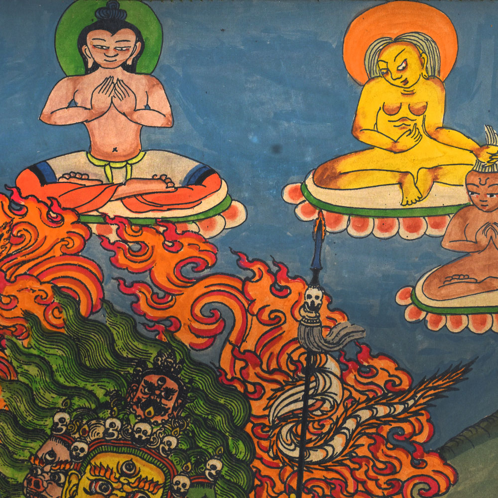 Vajrabhairava is a Buddhist meditational deity who is worshipped as the destroyer of death. Yamantaka is a wrathful emanation of Manjushri and the keeper of the grand tantra of the ultimate level of yoga known as Anuttarayoga. The first pair of hands is pressing a curved knife and a skull cup against the heart. The remaining hands are clutching a slew of weapons, body parts, and things. The right legs are bowed, pressing down on a man, animals, and gods. The left legs are straight and pressing down on eight birds and various deities. He wears bracelets, necklaces, and a girdle made of interlaced bone ornaments, as well as a snake necklace and a long chain of decapitated heads. Vajrabhairava is encircled by red and yellow flames.