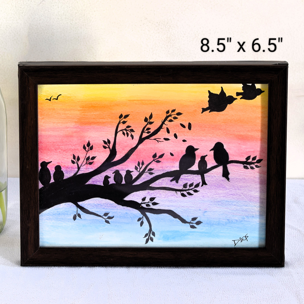 A heartwarming mixed media painting titled “The Birds Family” depicting a group of birds perched together on a tree branch, symbolizing unity, care, and familial warmth. The silhouettes are set against a softly blended watercolor sky in shades of yellow, orange, pink, and violet, evoking the peaceful charm of a sunset. This artwork beautifully combines emotional depth with aesthetic appeal, perfect for home décor or gifting to loved ones.