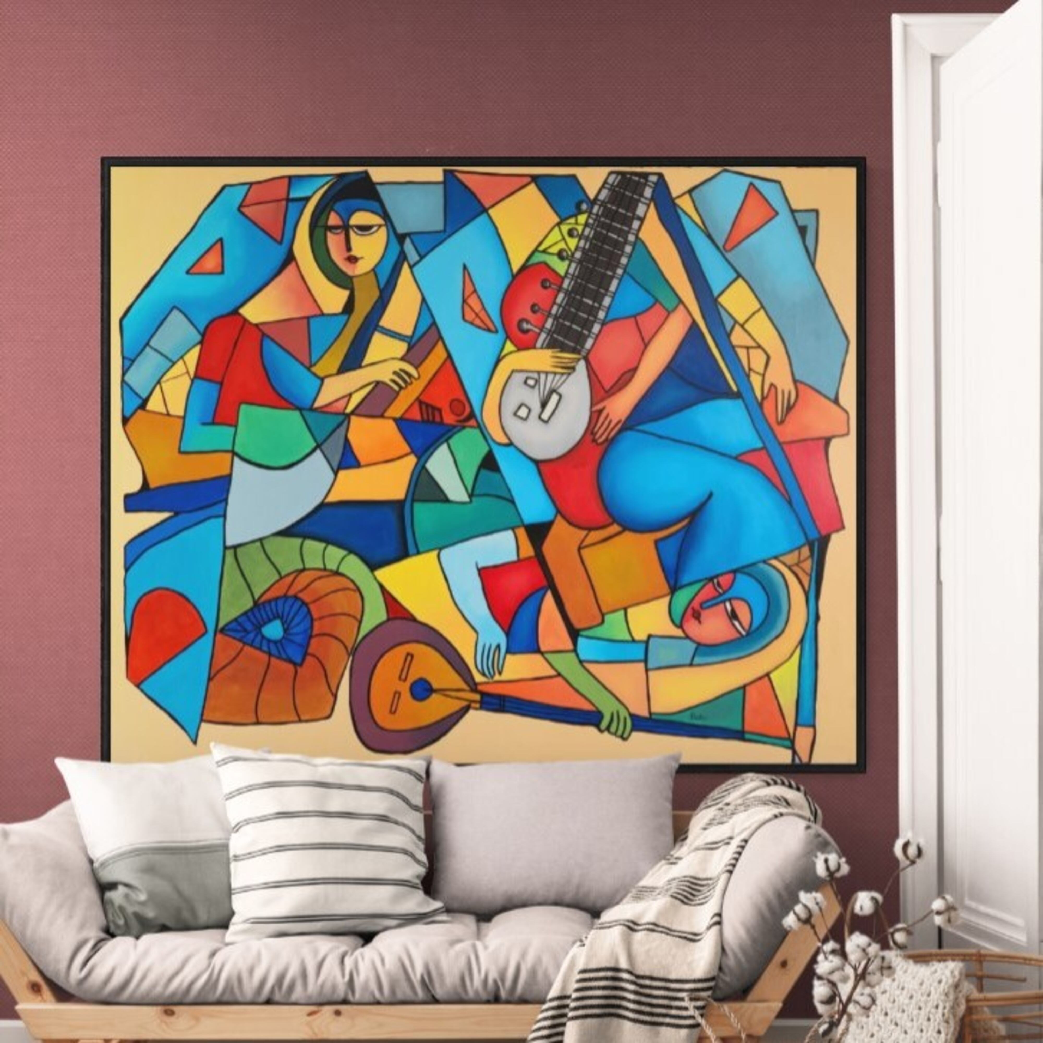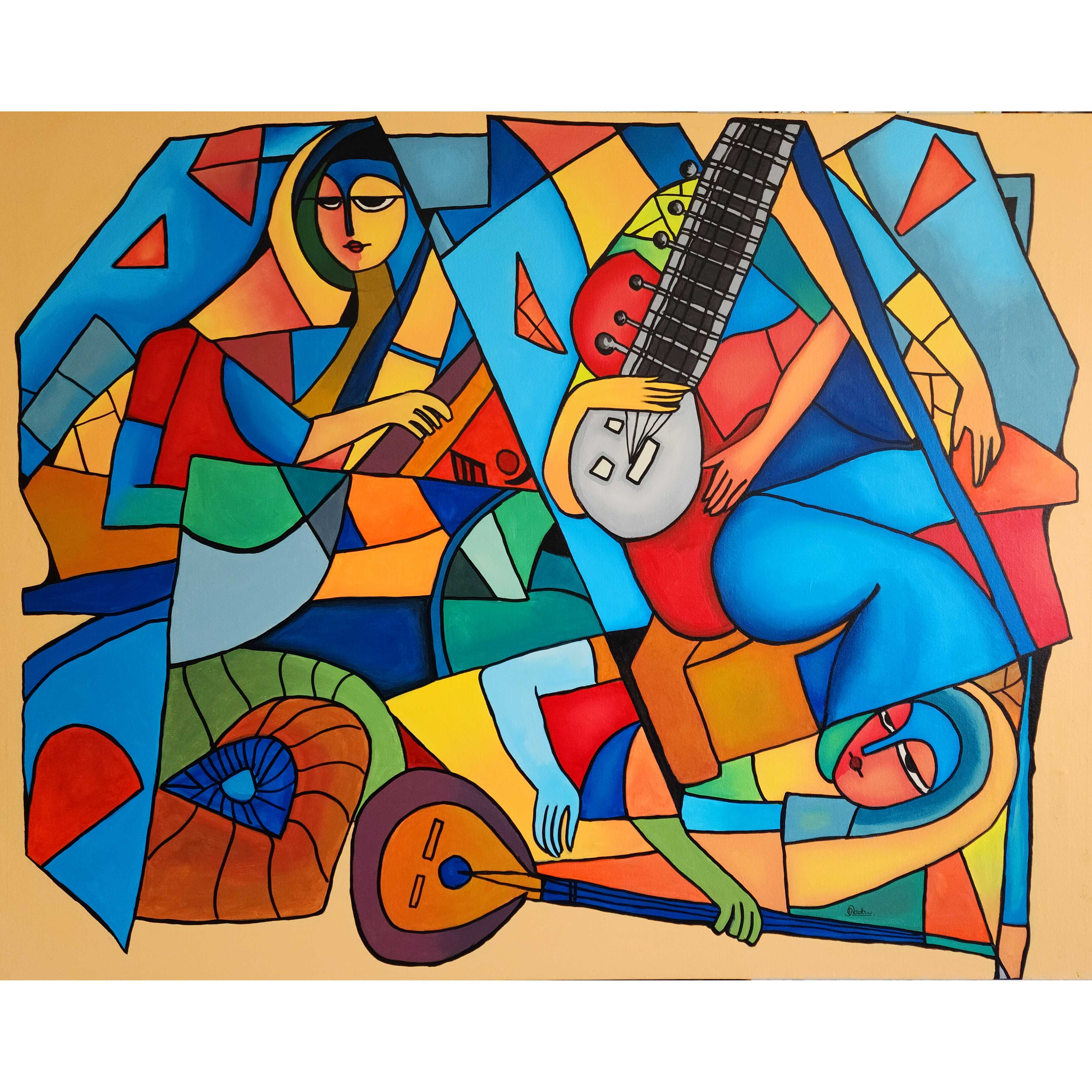 ”The Divine Ecstasy” is a vibrant 48” H x 60” W acrylic painting on unstretched canvas, showcasing a cubist-inspired composition that captures a profound spiritual and musical connection. The artwork features three stylized figures, their forms fragmented into bold geometric shapes with a vivid palette of blues, reds, yellows, and greens. At the center, a figure plays a stringed instrument, possibly a sitar, with intense focus, while another figure appears to be in a state of serene contemplation, eyes closed, as if lost in the music’s divine rhythm. The third figure, holding a smaller instrument, adds to the harmonious scene. Swirling patterns and contrasting colors create a sense of movement and emotional depth, reflecting the ecstatic union of music and spirituality. The painting is shipped in a roller tube for safe delivery.