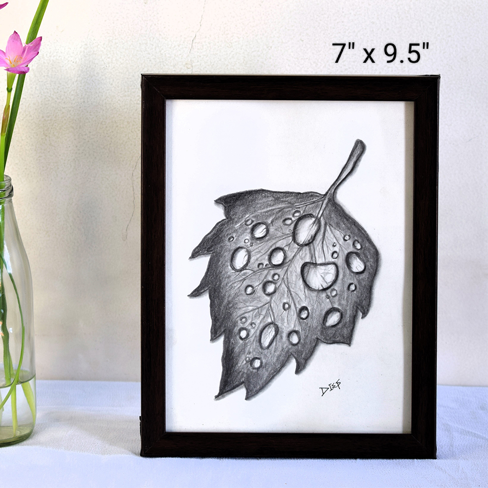 A beautifully realistic pencil sketch titled “The Droplets on Leaf” portraying a textured leaf delicately holding glistening water droplets. Each droplet is rendered with precise shading to create a lifelike, three-dimensional effect that enhances the natural form of the leaf. This monochrome artwork captures a fleeting yet serene moment in nature, perfect for adding subtle elegance and calm to any space.