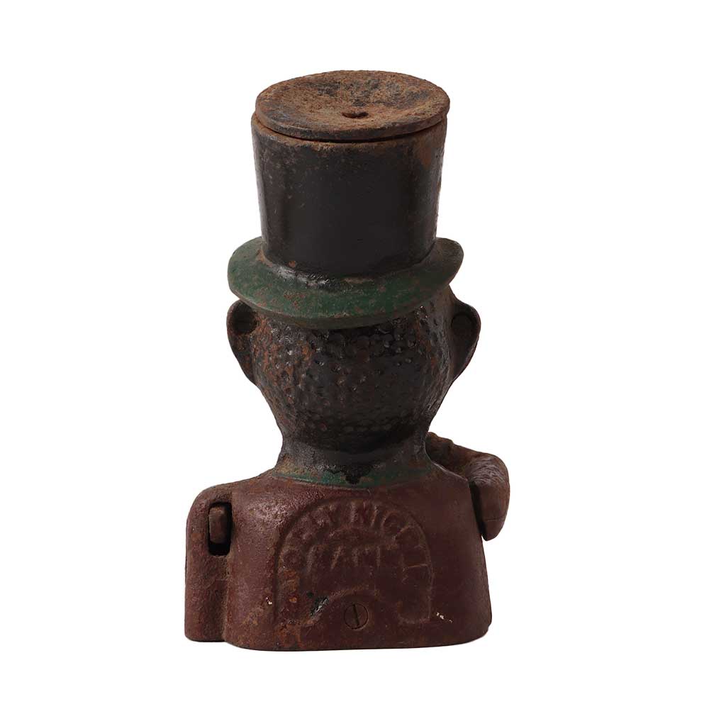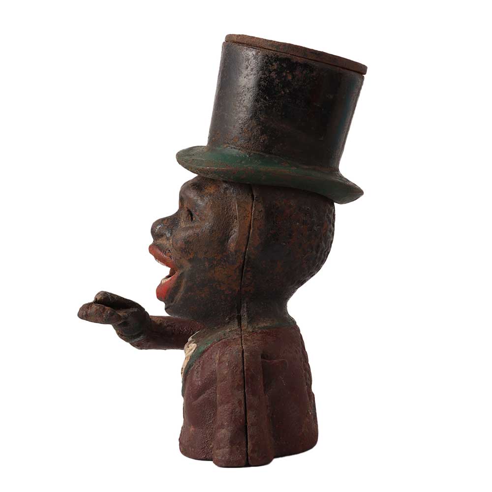 The Jolly Boy Bank is a type of "Black Americana" collectible item a statue that was produced in the early 20th century. It is a metal bank in the form of a bus statue of a black man wearing a top hat. The bust is mounted on a metal base and has a coin slot on the back, allowing people to save their coins. The Jolly Boy Bank was popular during the early 1900s and is now a highly sought-after collectible by fans of Black Americana memorabilia and vintage coin banks. The value of a Jolly Boy Bank is determined by its condition, rarity, and the historical significance of the design. Many examples of these banks are now housed in museums or private collections and are considered valuable investments for collectors of antique and vintage Americana items. Some variations of the Jolly Boy Bank exist, including ones featuring different poses or clothing, and these can also be of interest to collectors.