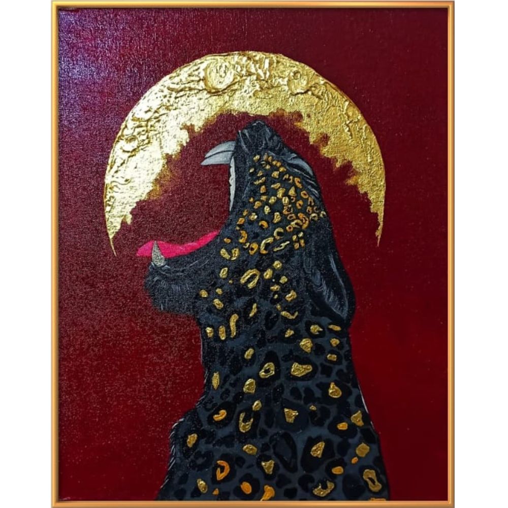 “THE REGAL ROAR” embodies untamed power and rare elegance. The leopard, painted in bold strokes and highlighted with luminous gold leaf, emerges against a radiant celestial moon. The artwork captures both ferocity and grace, symbolizing courage, mystery, and resilience. Its intricate details and luxurious golden textures make it a true collector’s piece—an artwork that transforms any space into a statement of strength and sophistication.