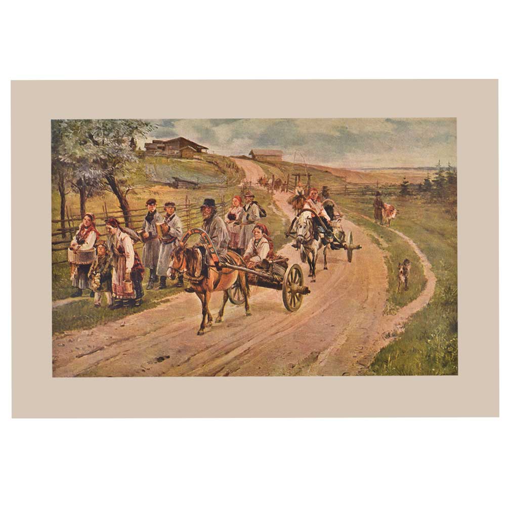 The painting is very old and it shows a peasants family returning from the market to buy their groceries . It was a routine of the farmers to take their famiy to the big market in the city to buy geroceries and clothes as these things were not available in their local market on horse driven carts .