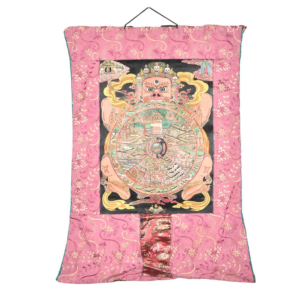 The wheel of life (bhavachakra in sanskrit, or samsara for others) is often found on the exterior walls of the monasteries, on either side of the main entrance. It represents samsara which is a synonim of the word life.
