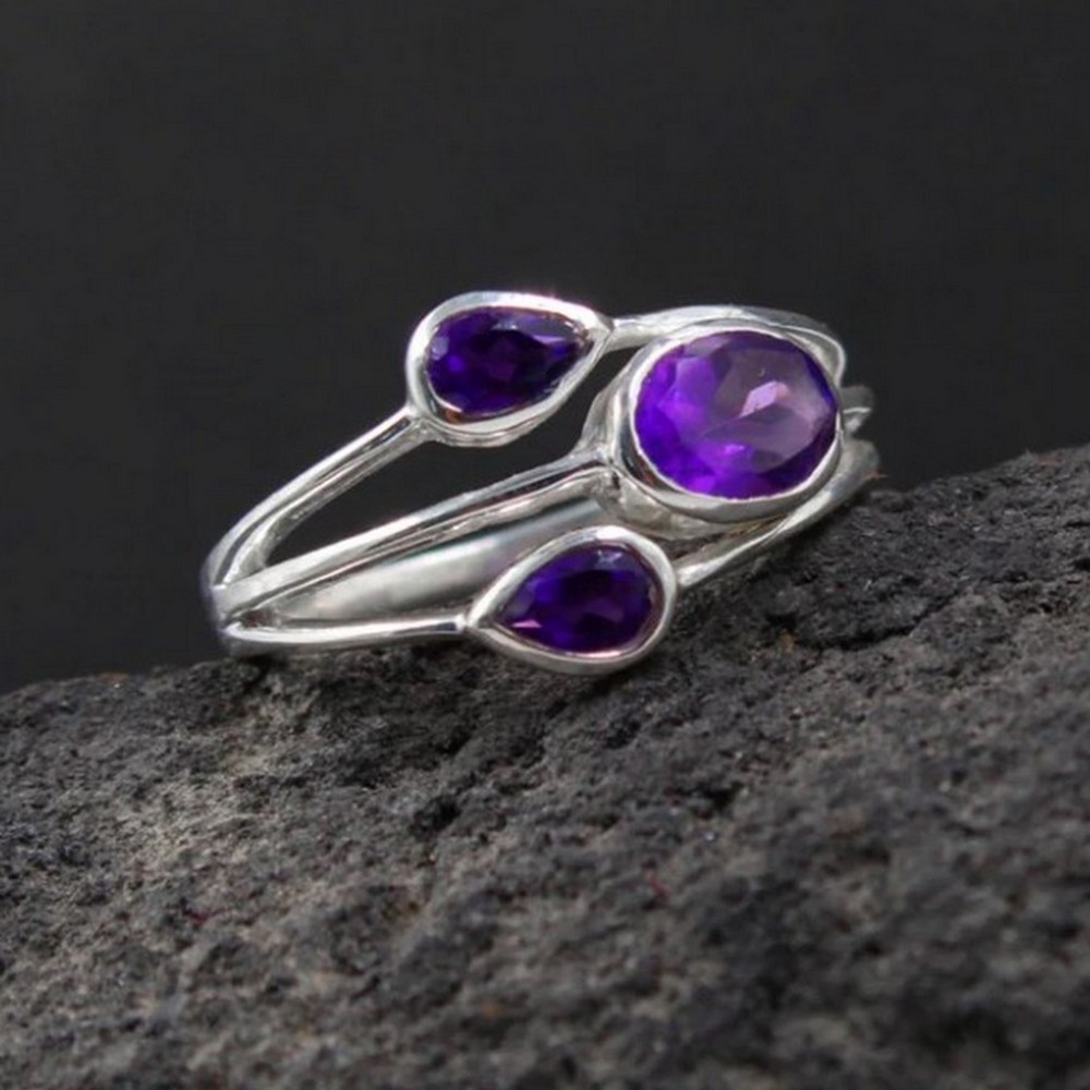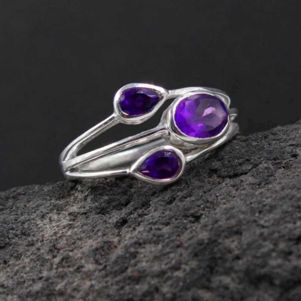 Three Amethyst 925 Sterling Silver Ring Handmade Boho Jewelry
